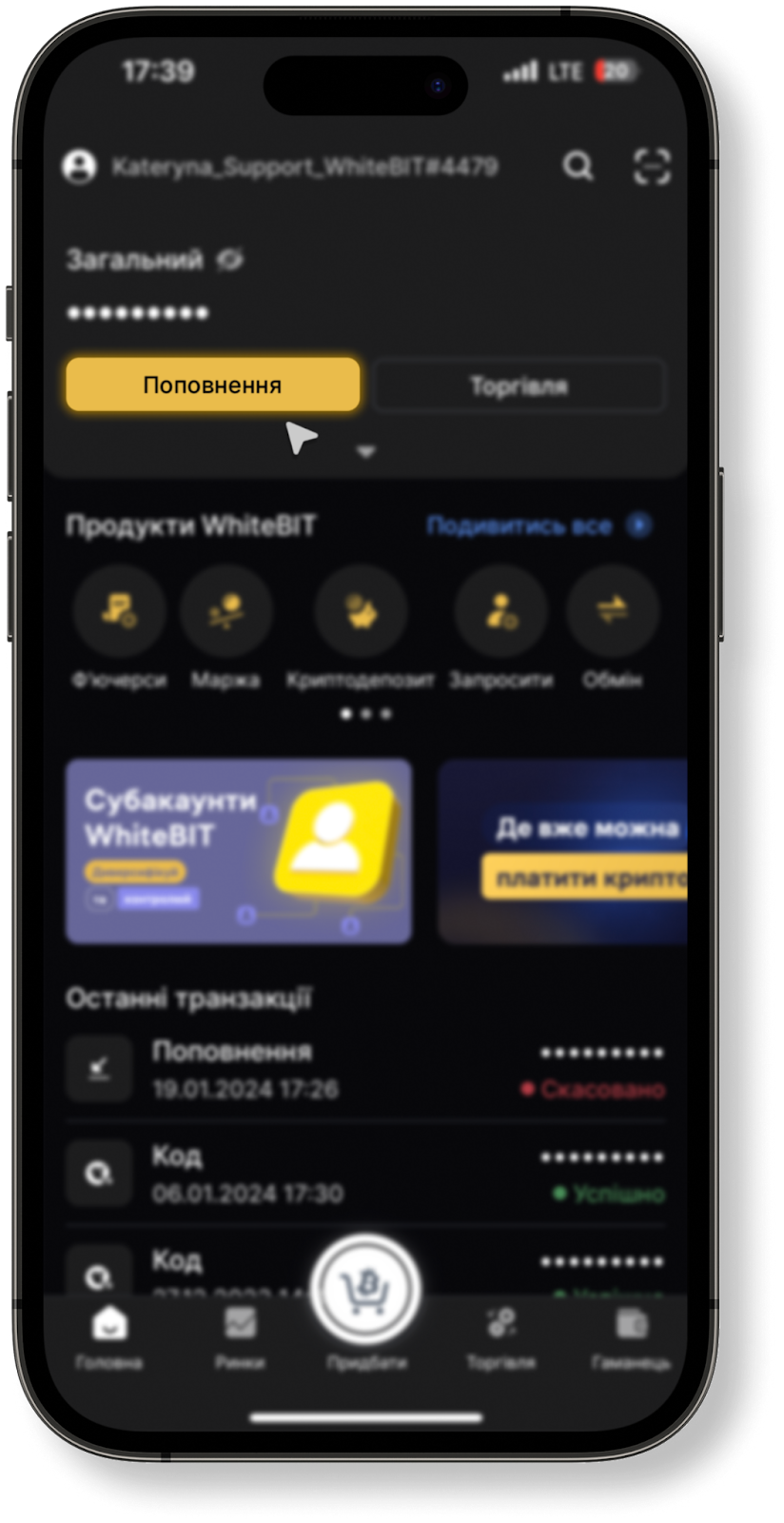 в правому нижньому кутку екрана (у застосунку WhiteBIT у правому верхньому кутку натисніть