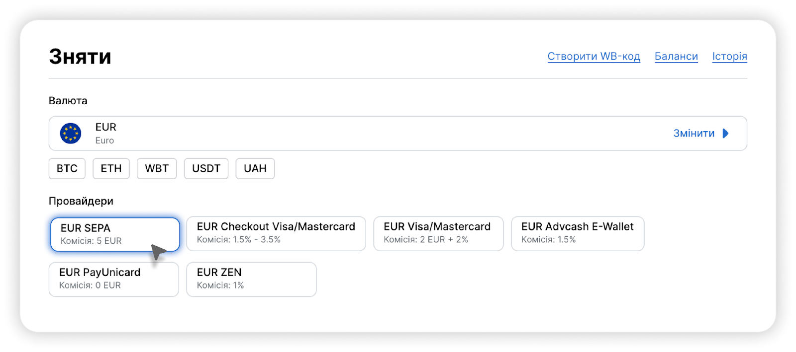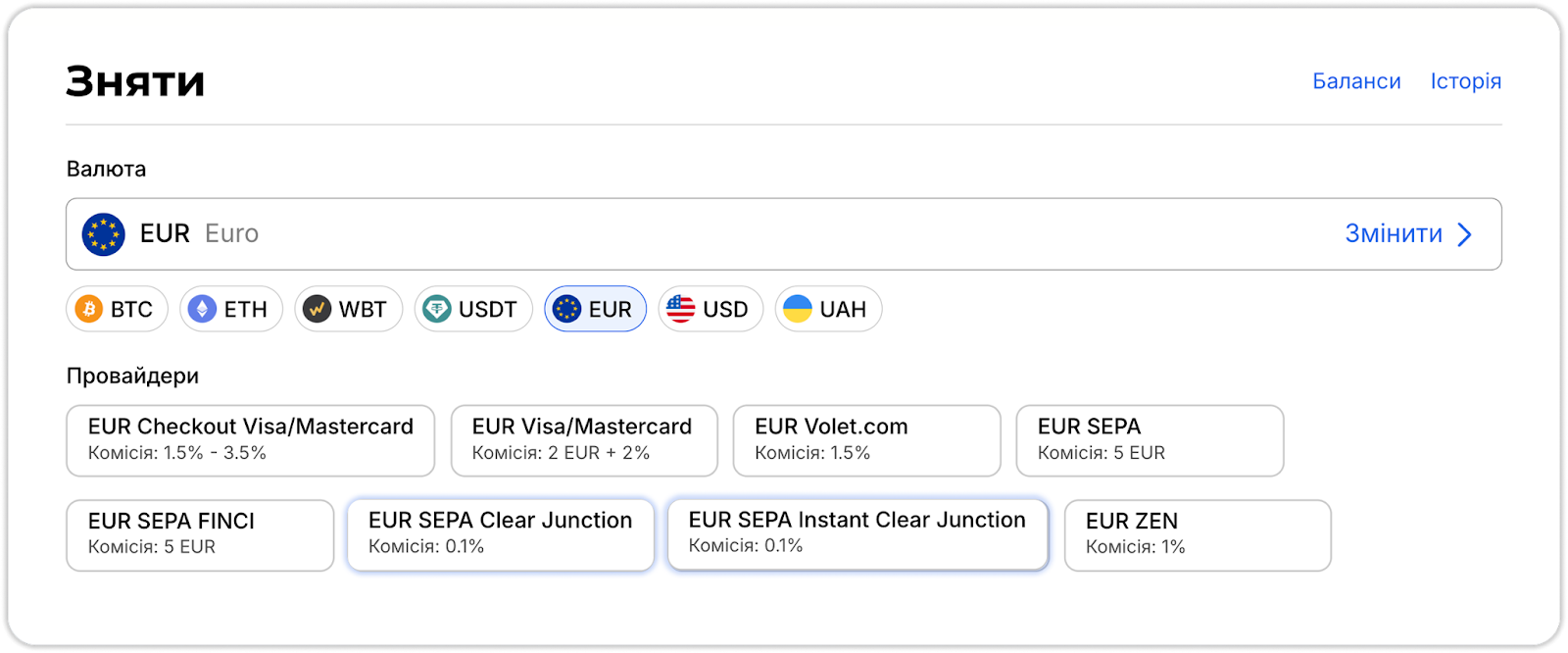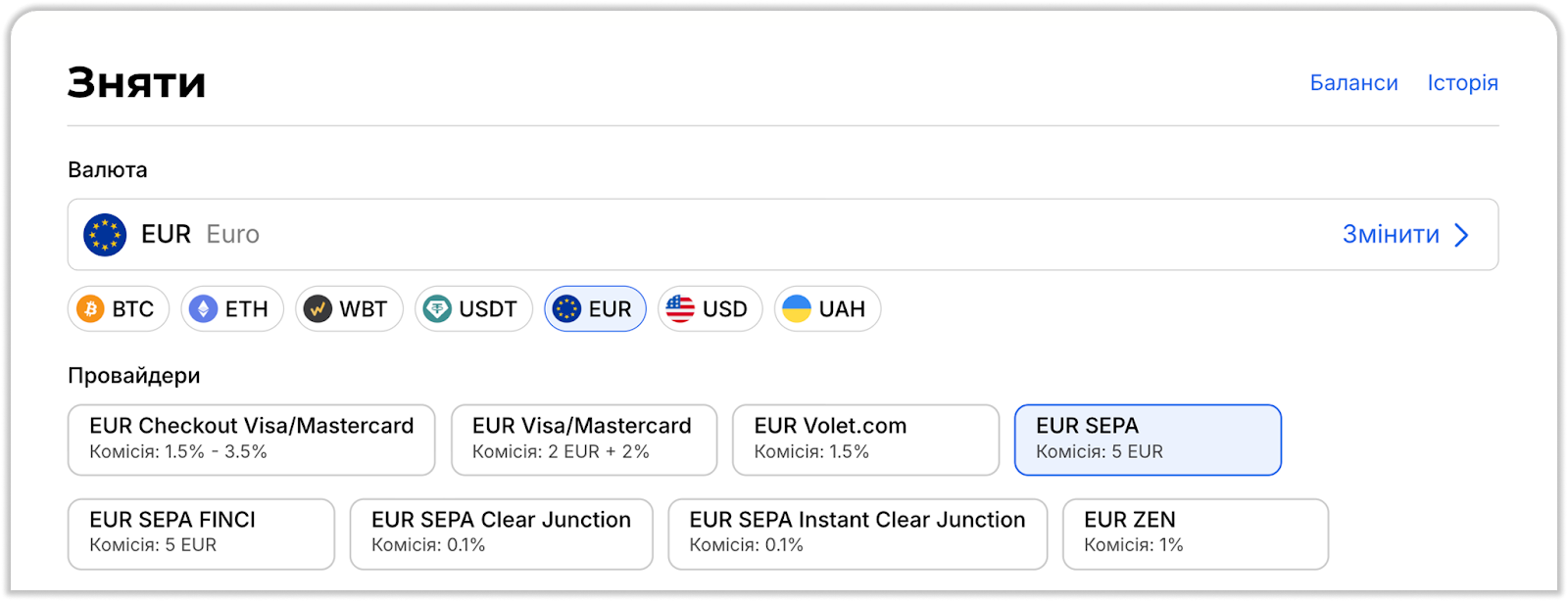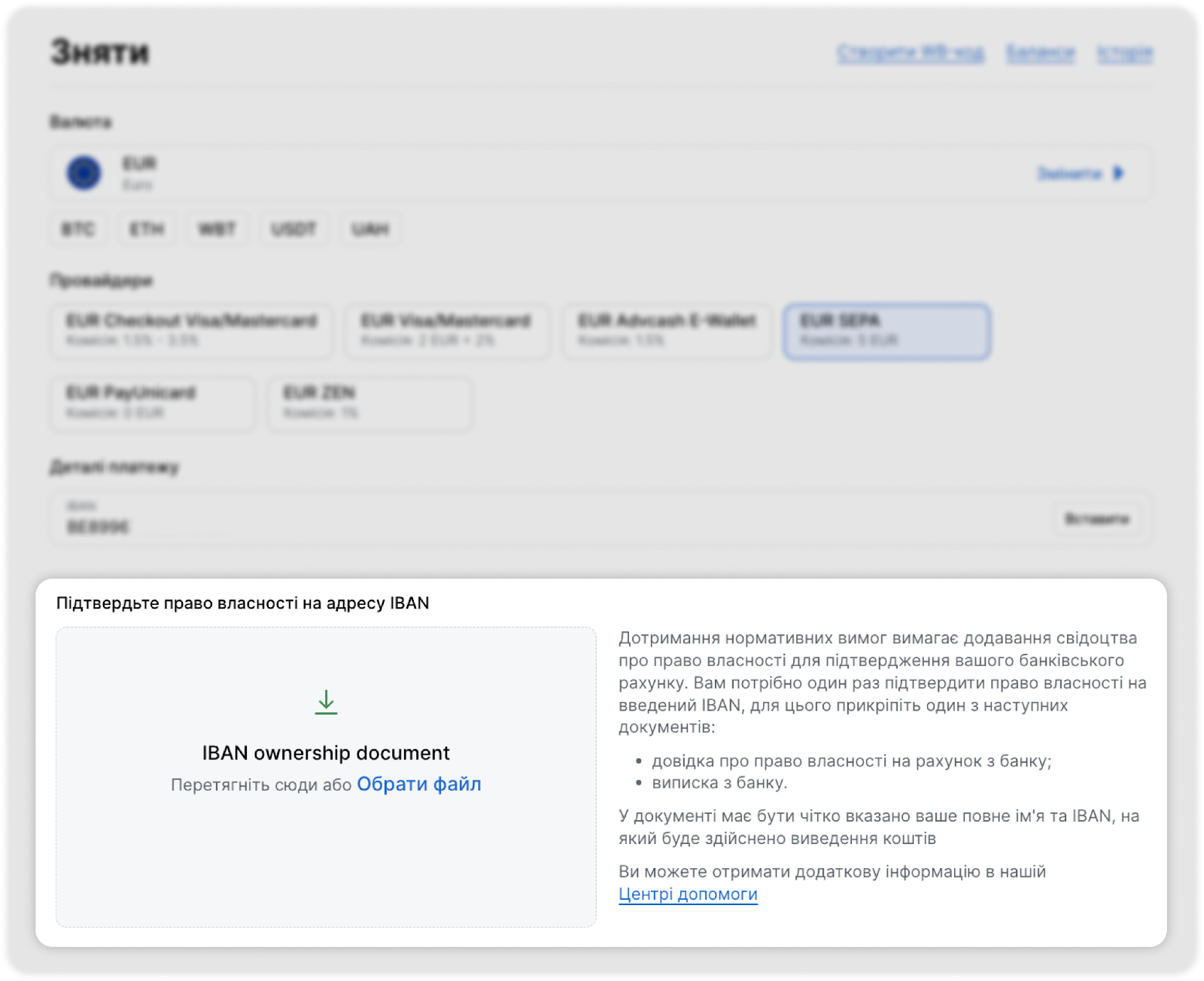 Зверніть увагу: виведення коштів через SEPA на IBAN доступне тільки для EUR.