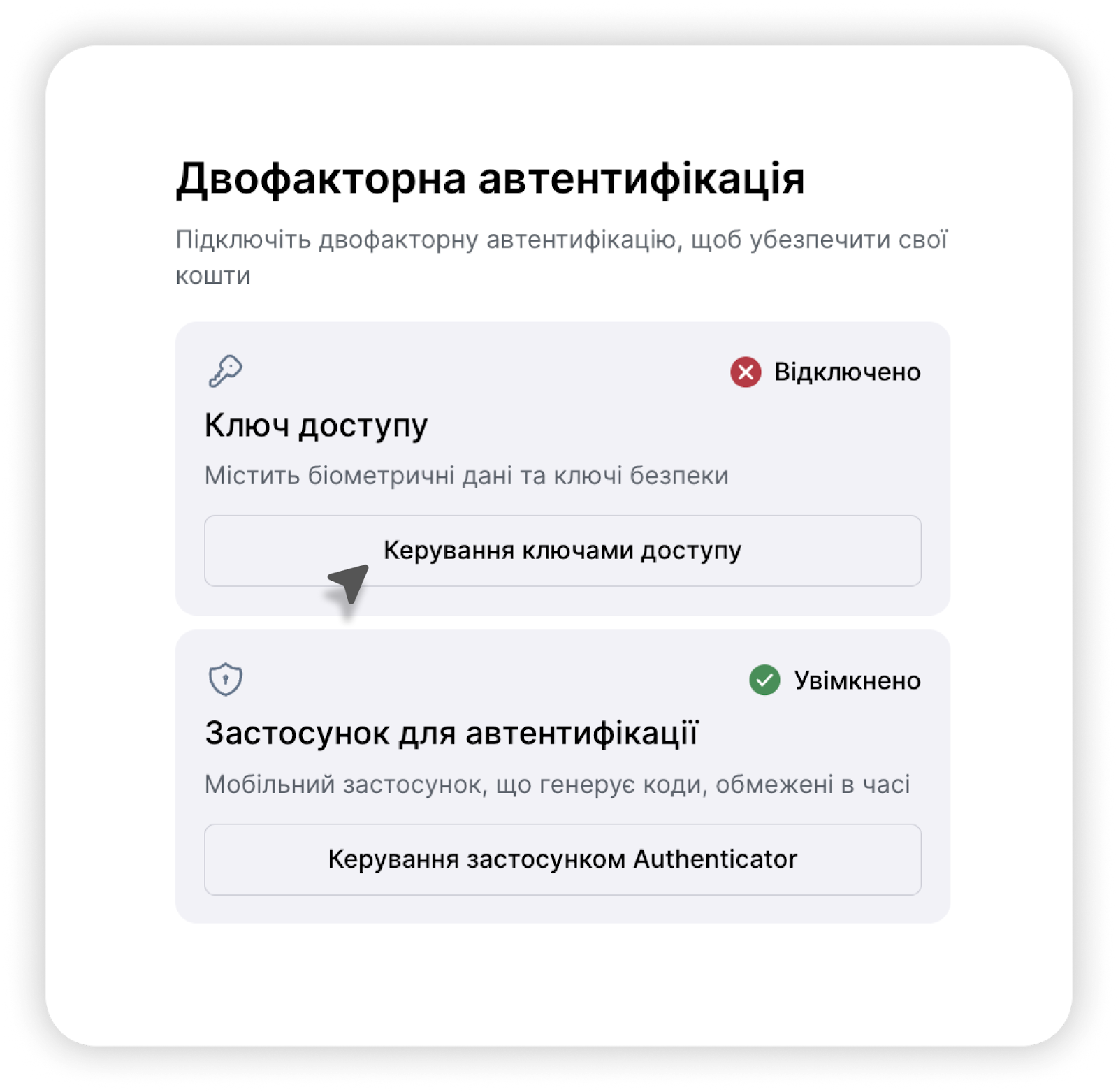 Зверніть увагу: ми рекомендуємо, за можливості, використовувати фізичні ключі, оскільки вони є найбільш надійними.