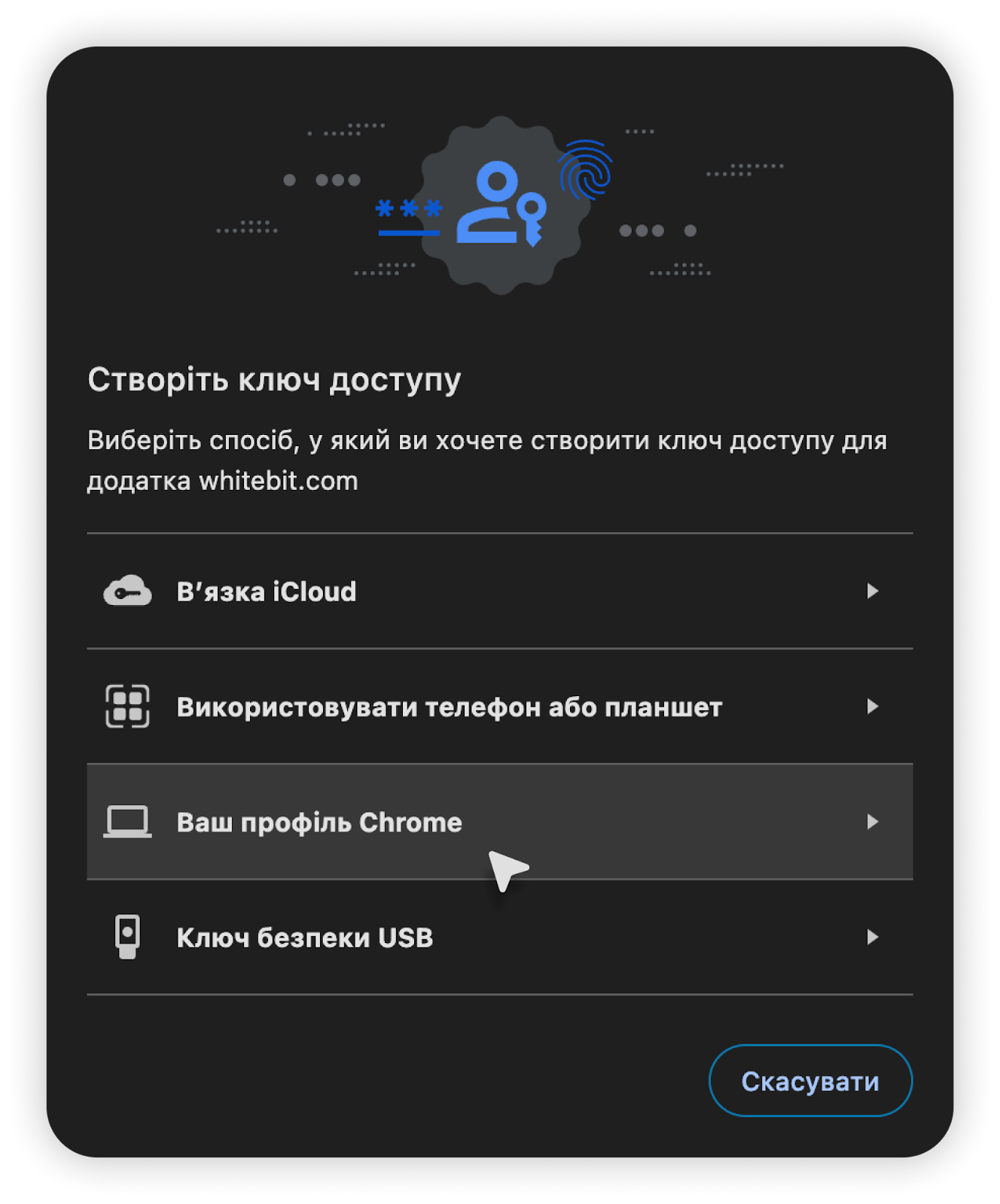 4. Зареєструйте ключ доступу, обравши один зі способів для автентифікації;