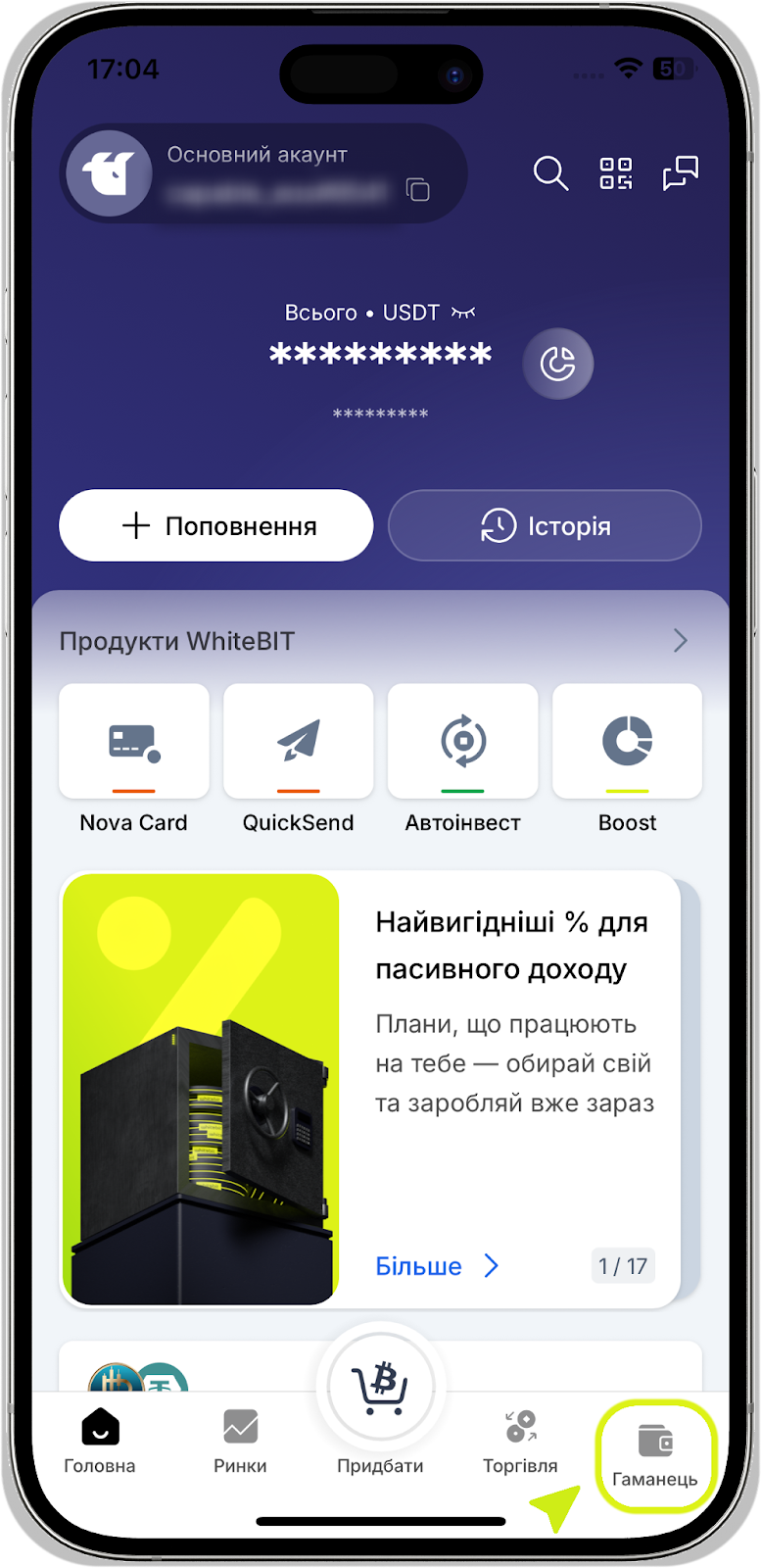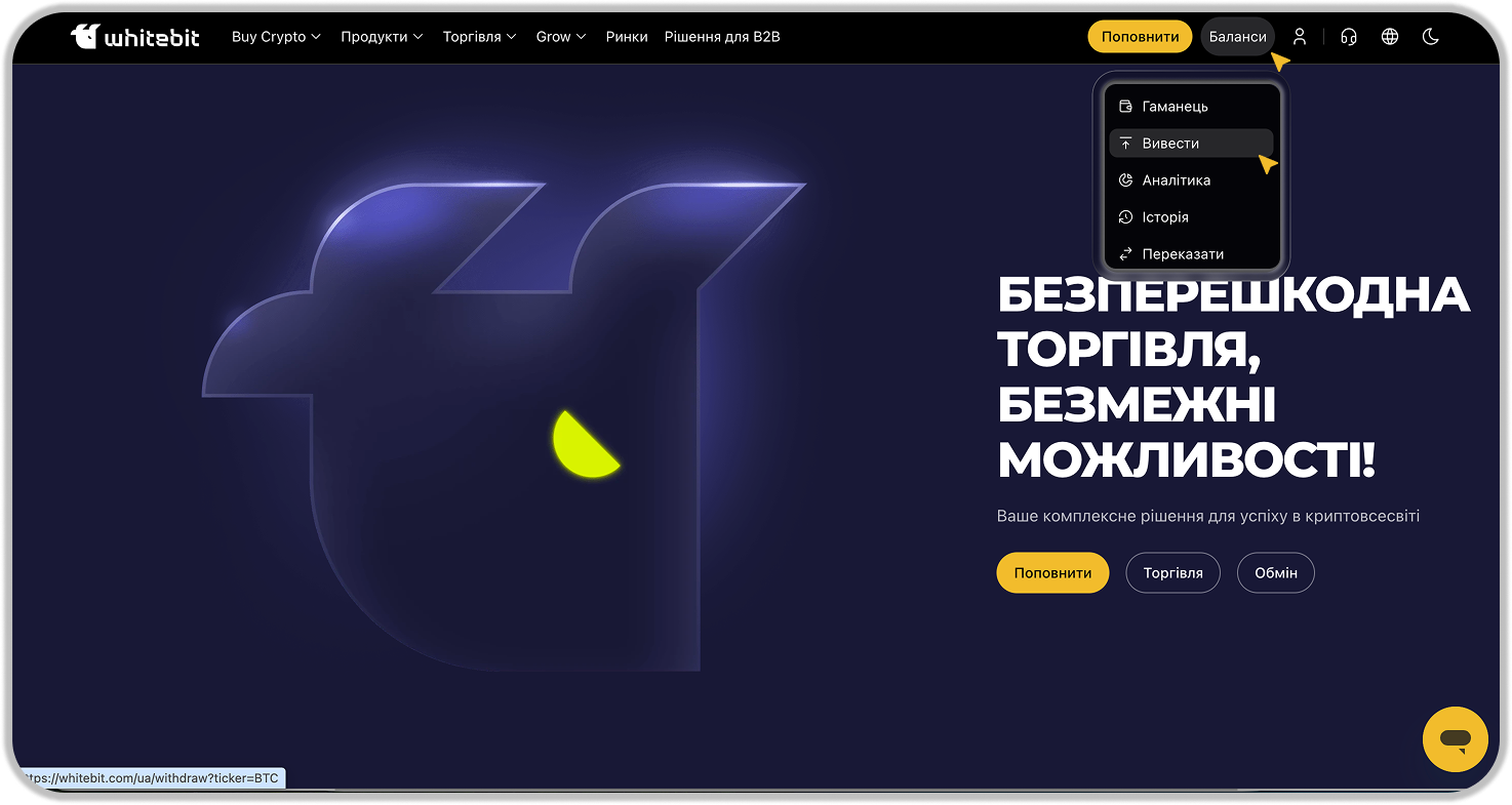 Відкривши головну сторінку додатка WhiteBIT, ви можете перейти до форми виведення коштів через вкладку «Гаманець» - «Вивести».