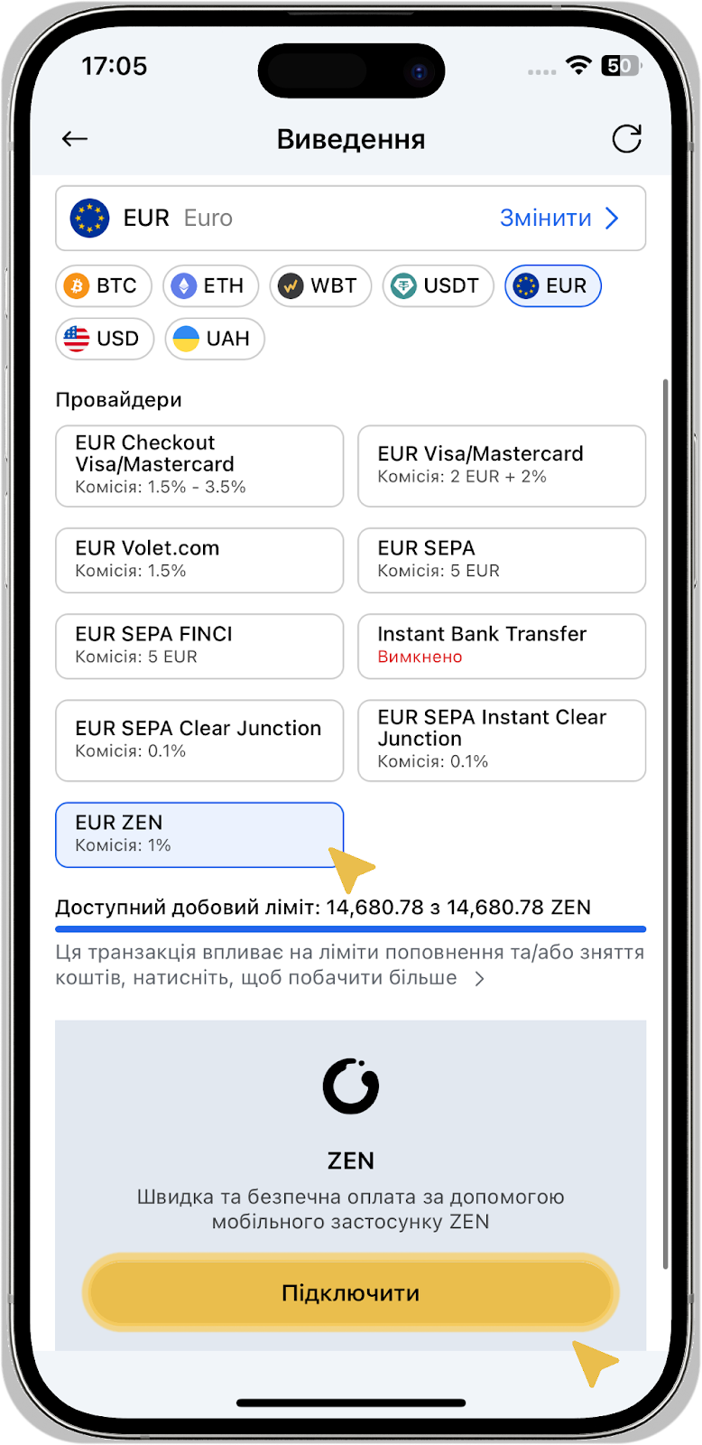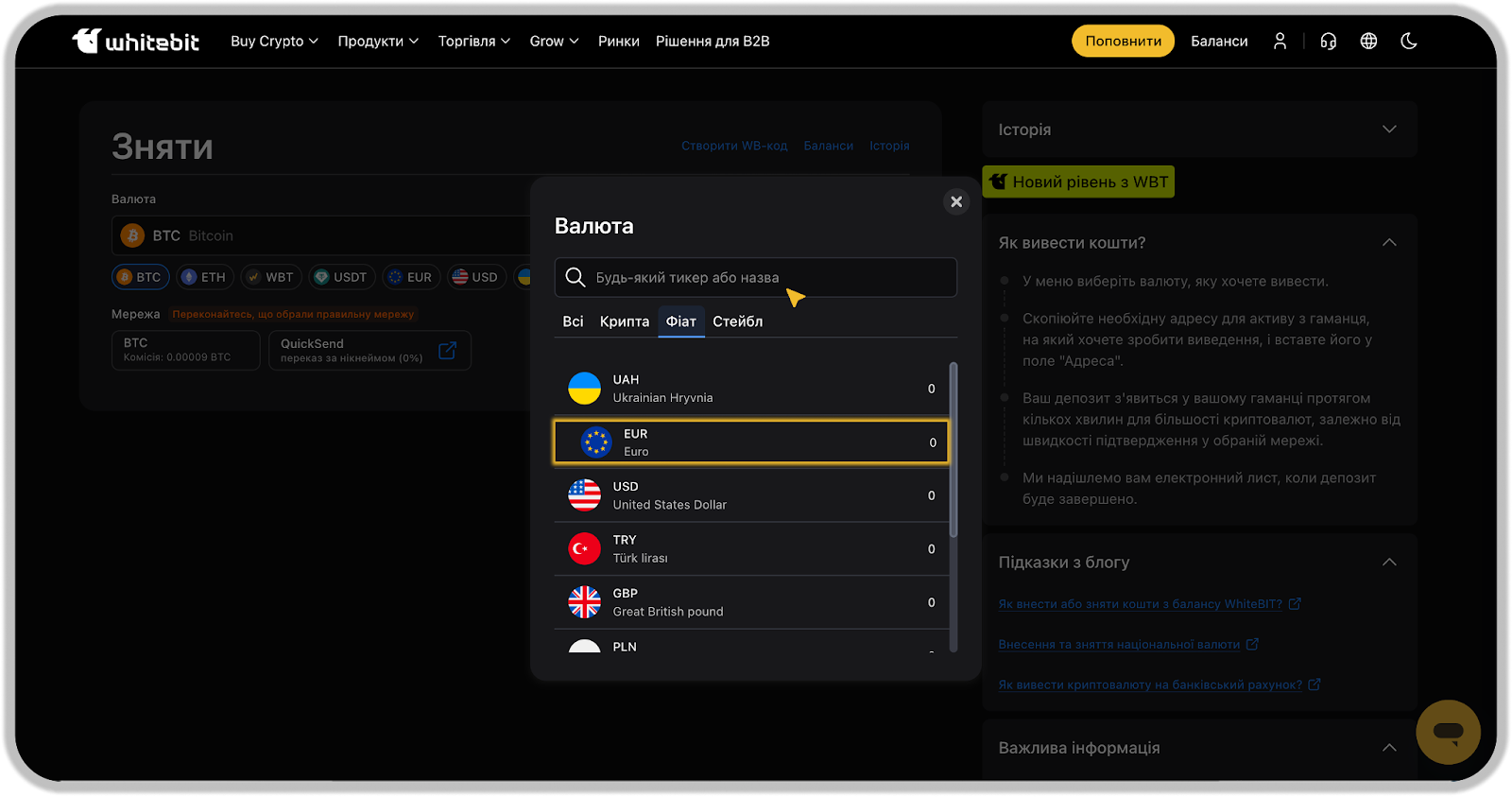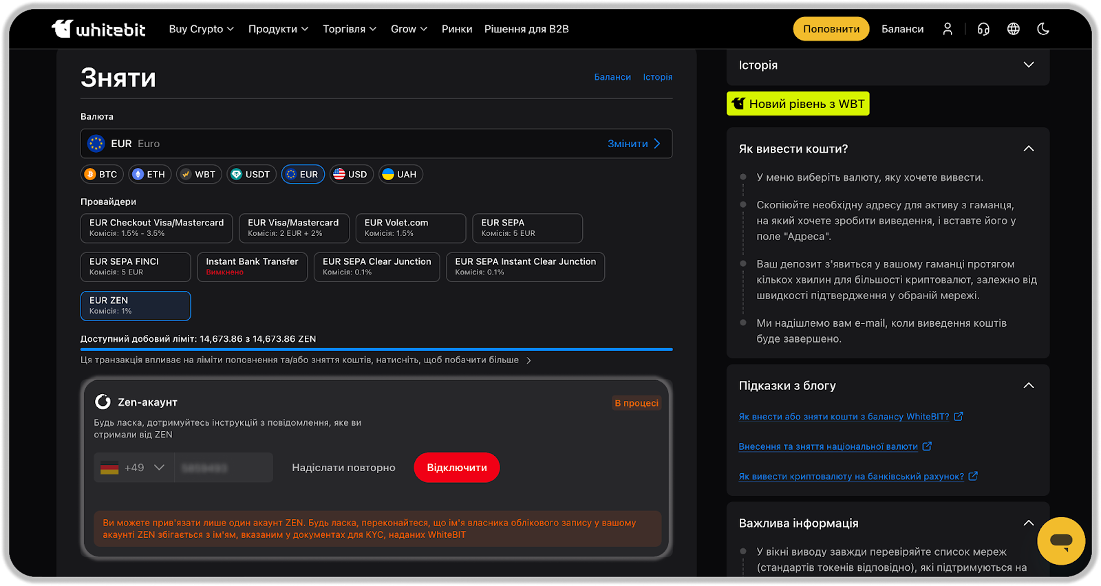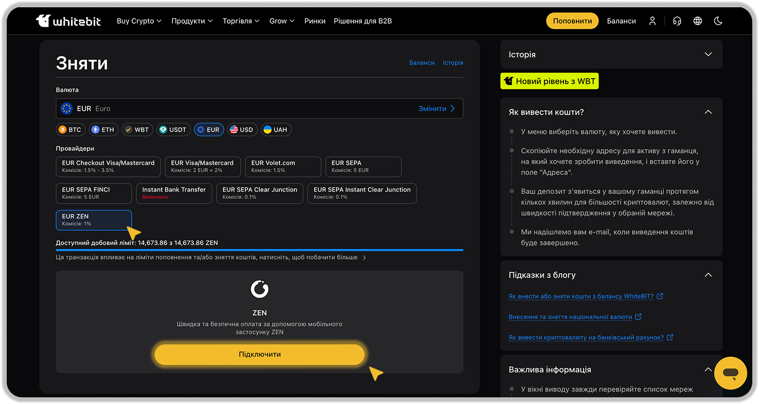 6. Виберіть ZEN як метод для виведення коштів в EUR з WhiteBIT. Для підтвердження та створення запиту на виведення коштів вам необхідно: