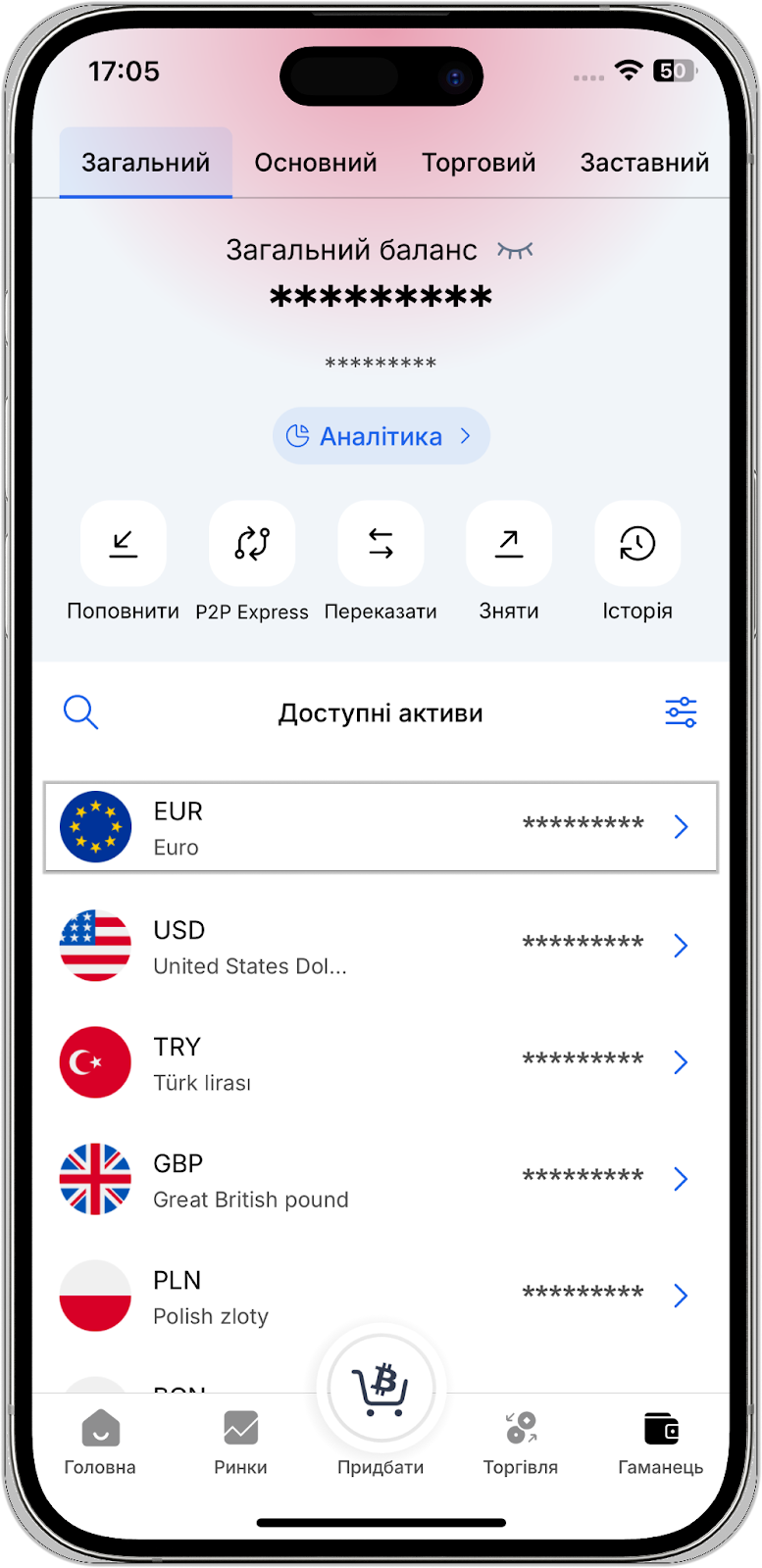 1. Перейдіть на головну сторінку біржі та натисніть на кнопку "Баланси - Гаманець" - "Загальний"/"Основний".