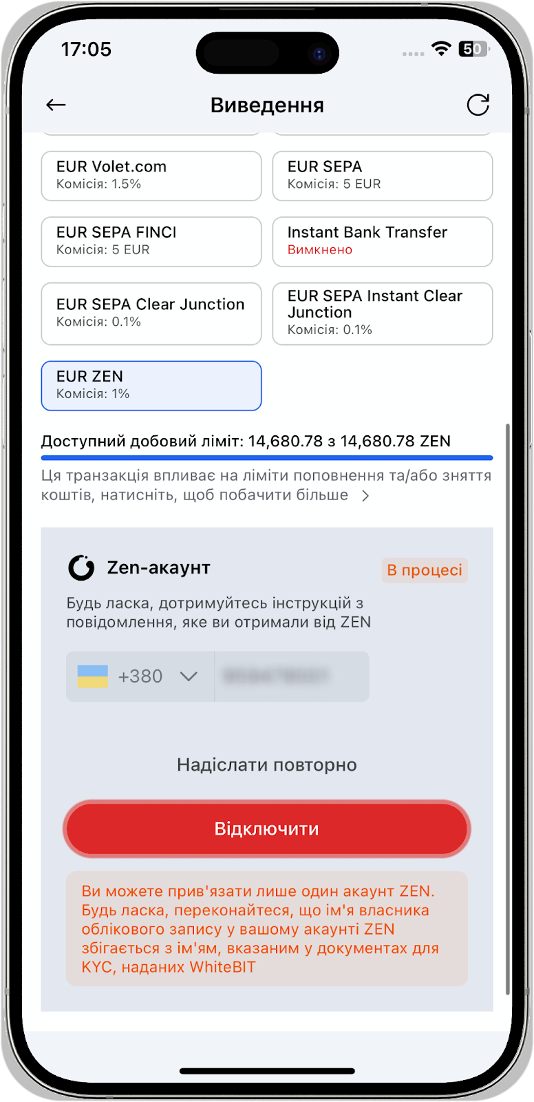 Зверніть увагу, що ви можете підключити тільки один рахунок ZEN. Переконайтеся, що ім'я власника рахунку ZEN збігається з ім'ям власника рахунку в документах KYC, наданих у WhiteBIT.