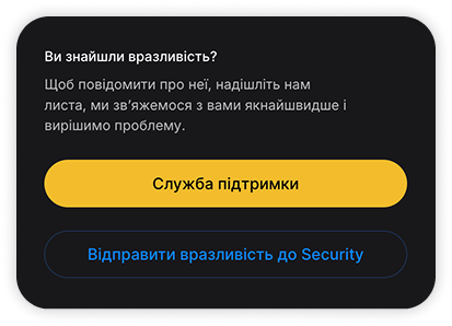 Зверніть увагу: спосіб участі в Bug Bounty (через сторінку на нашій біржі або на Hackenproof) ніяк не впливає на винагороду від програми. Отже, ви можете надати звіт про вразливість будь-яким зручним для вас методом.