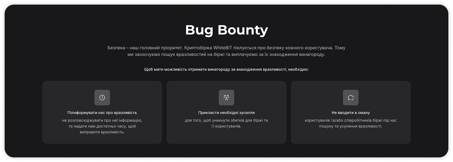 Баг баунті (Bug Bounty) – це активність, яка дає змогу отримати винагороду за виявлення різноманітних вразливостей на біржі. Оскільки безпека та надійність – основні принципи роботи біржі WhiteBIT, було реалізовано програму Bug Bounty, спрямовану на пошук помилок та вразливостей.