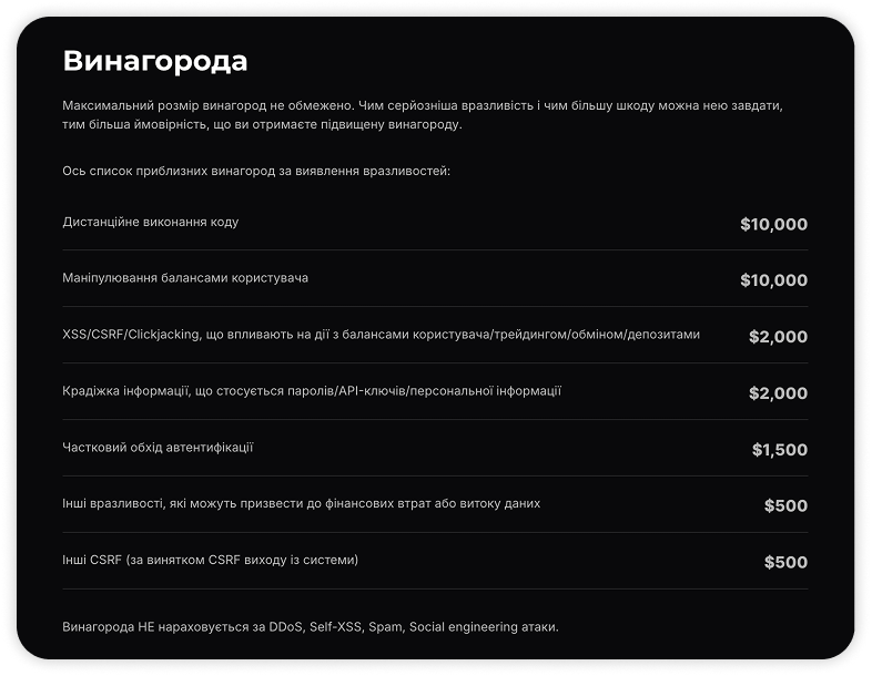 Зверніть увагу: біржа самостійно визначає рівень ризику для кожної повідомленої помилки після ретельної перевірки та підтвердження існування бага або вразливості. Важливо враховувати, що DDoS, Self-XSS, Spam, Social engineering атаки не підлягають винагороді.