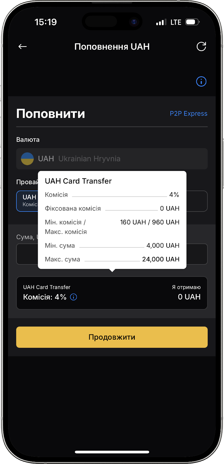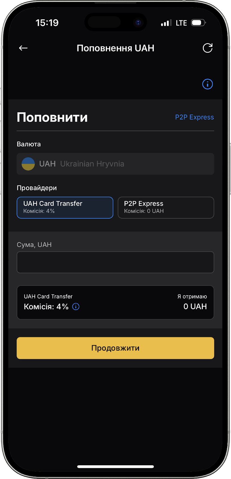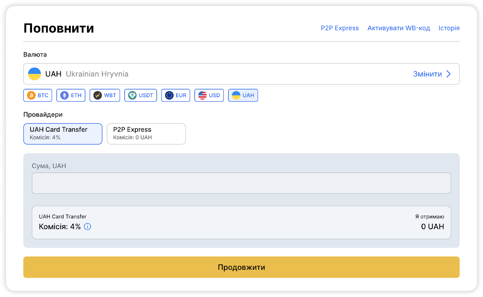 У вікні, що відкрилося оберіть поповнення за допомогою Card Transfer зі списку провайдерів. Вкажіть суму вашого поповнення.