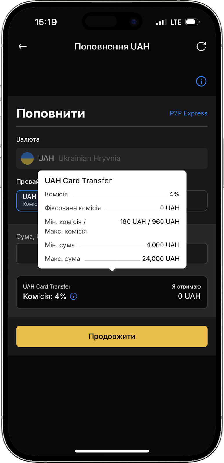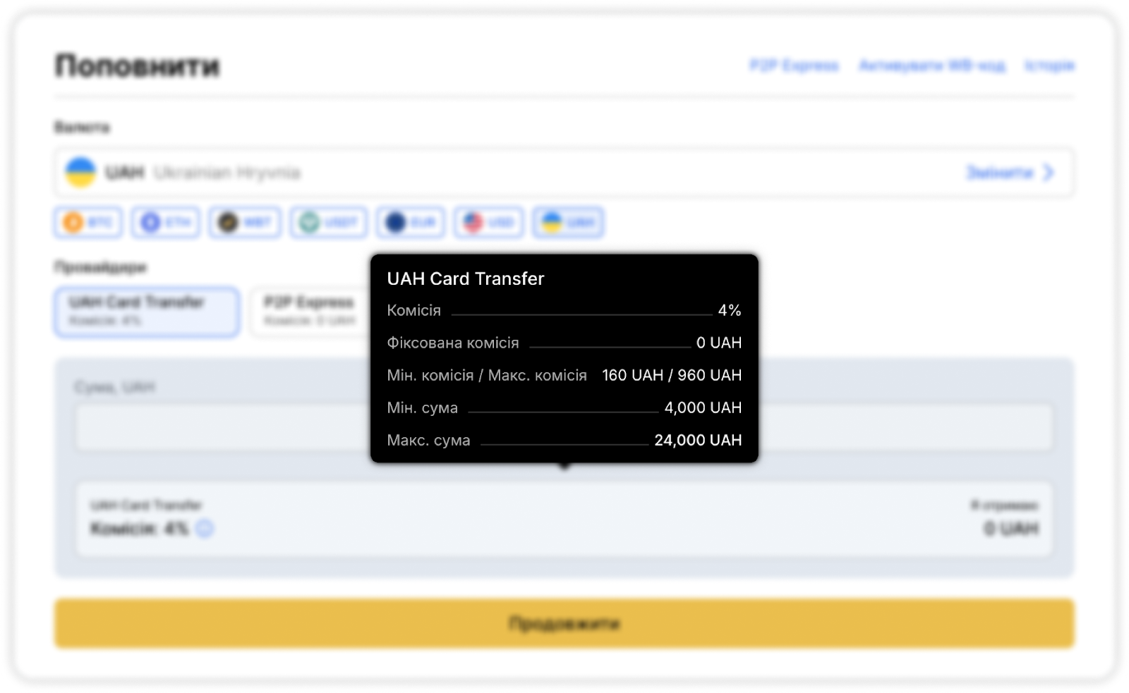 Зверніть увагу на денні ліміти для поповнення та суму депозиту, яку ви отримаєте з урахуванням комісії.