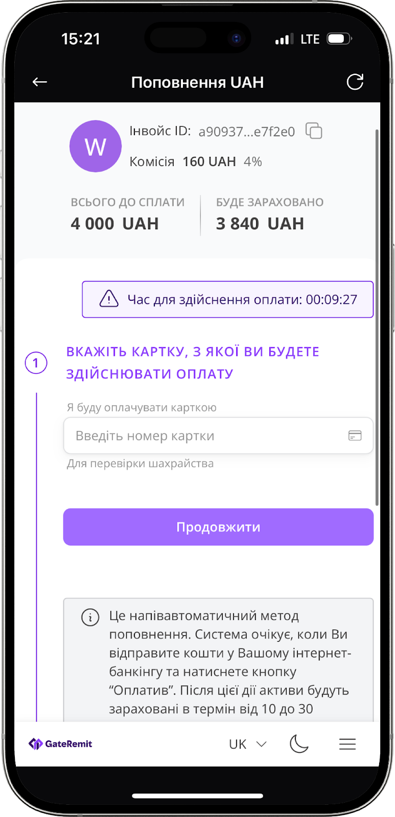 Після натискання на кнопку «Продовжити» відкриється сторінка, де надається 10 хвилин на оплату раніше створеного інвойсу.