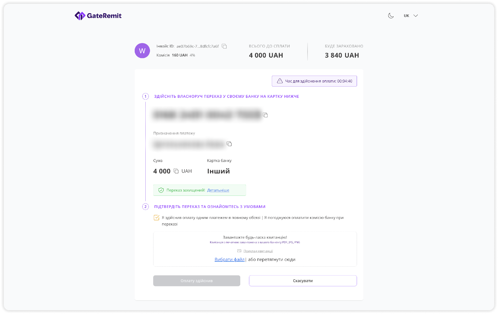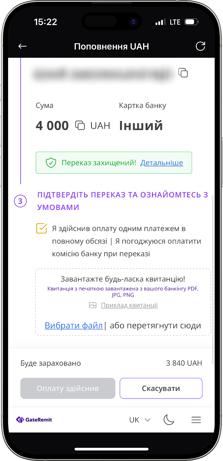 - Після переказу обов’язково завантажте квитанцію та натисніть кнопку «Оплату здійснив» — це підтвердження вашої оплати.