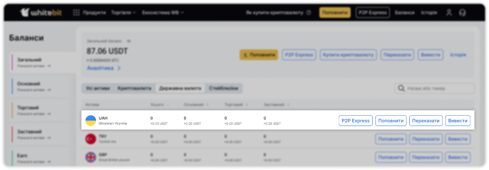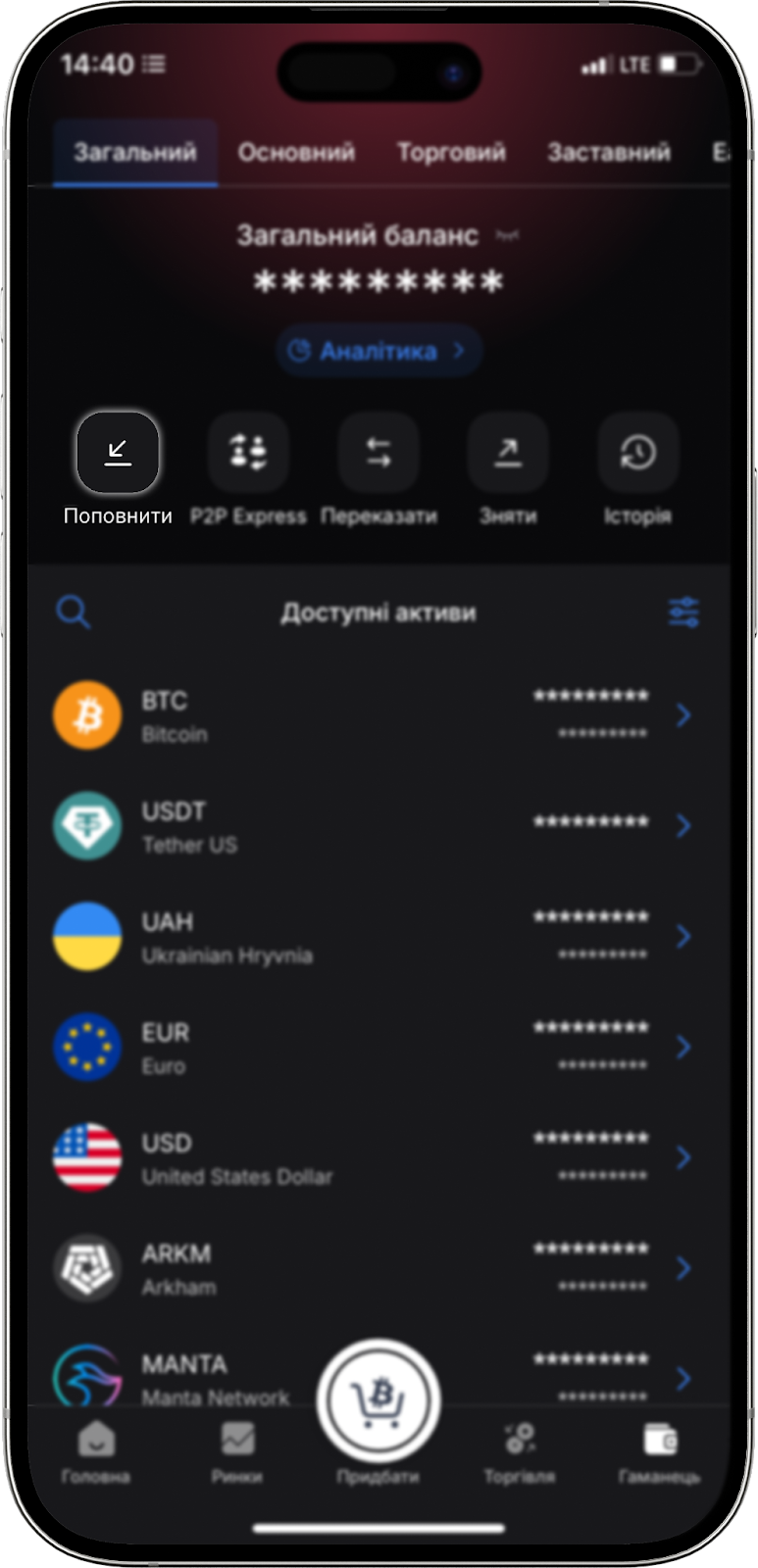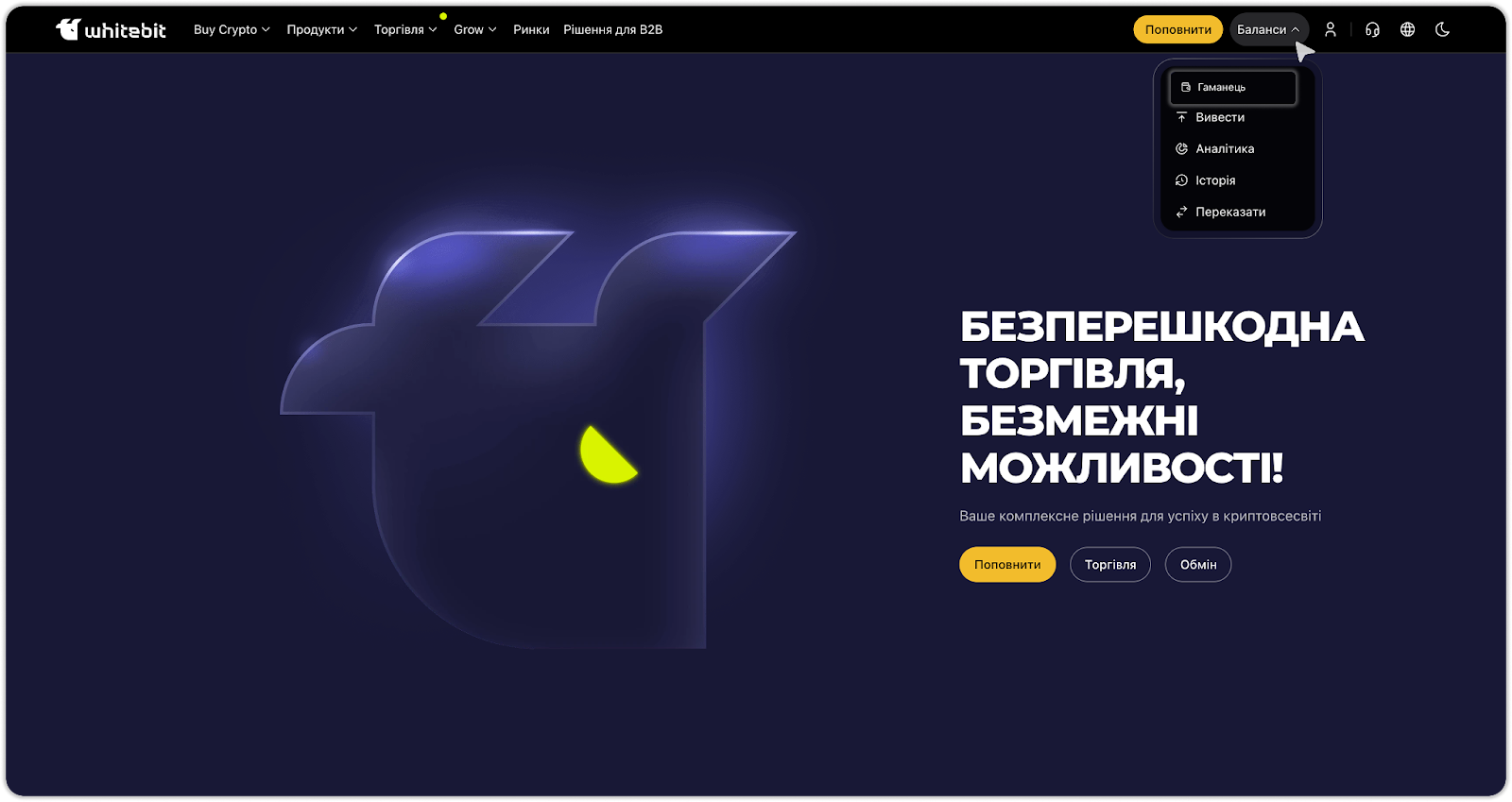 На головній сторінці біржі перейдіть у розділ “Баланси — Гаманець”.