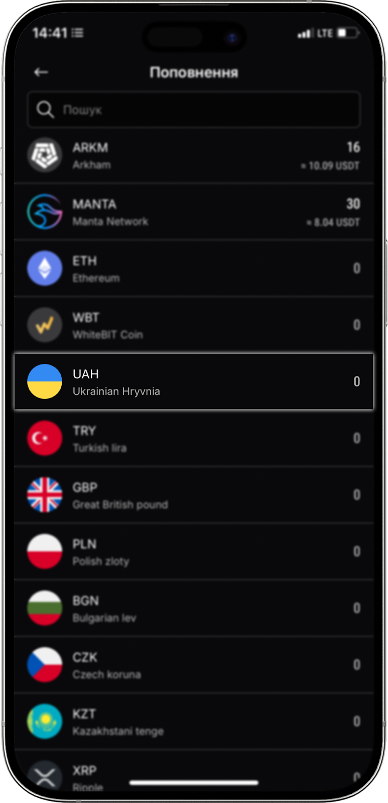 Знайдіть у списку українську гривню (UAH) або введіть тикер валюти в рядку пошуку. Натисніть на кнопку «Поповнити» праворуч від тикера обраної валюти.