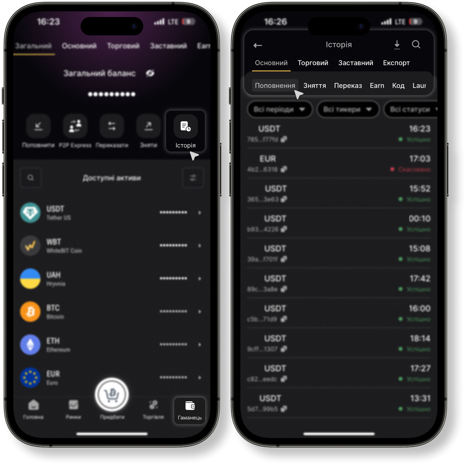 Щоб перевірити деталі поповнення, перейдіть у розділ «Гаманець» у застосунку WhiteBIT і виберіть значок «Історія».