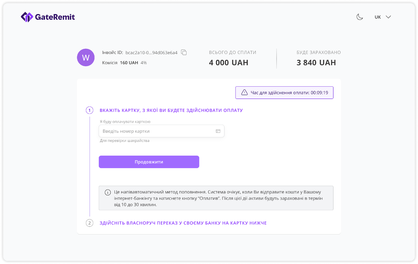 Card Transfer — зручний, швидкий та безпечний спосіб поповнення свого балансу в українській гривні (UAH) та виведення UAH на WhiteBIT. Використовуючи цю платіжну систему, виведені кошти надійдуть безпосередньо на вказаний вами номер банківської картки в інвойсі.
