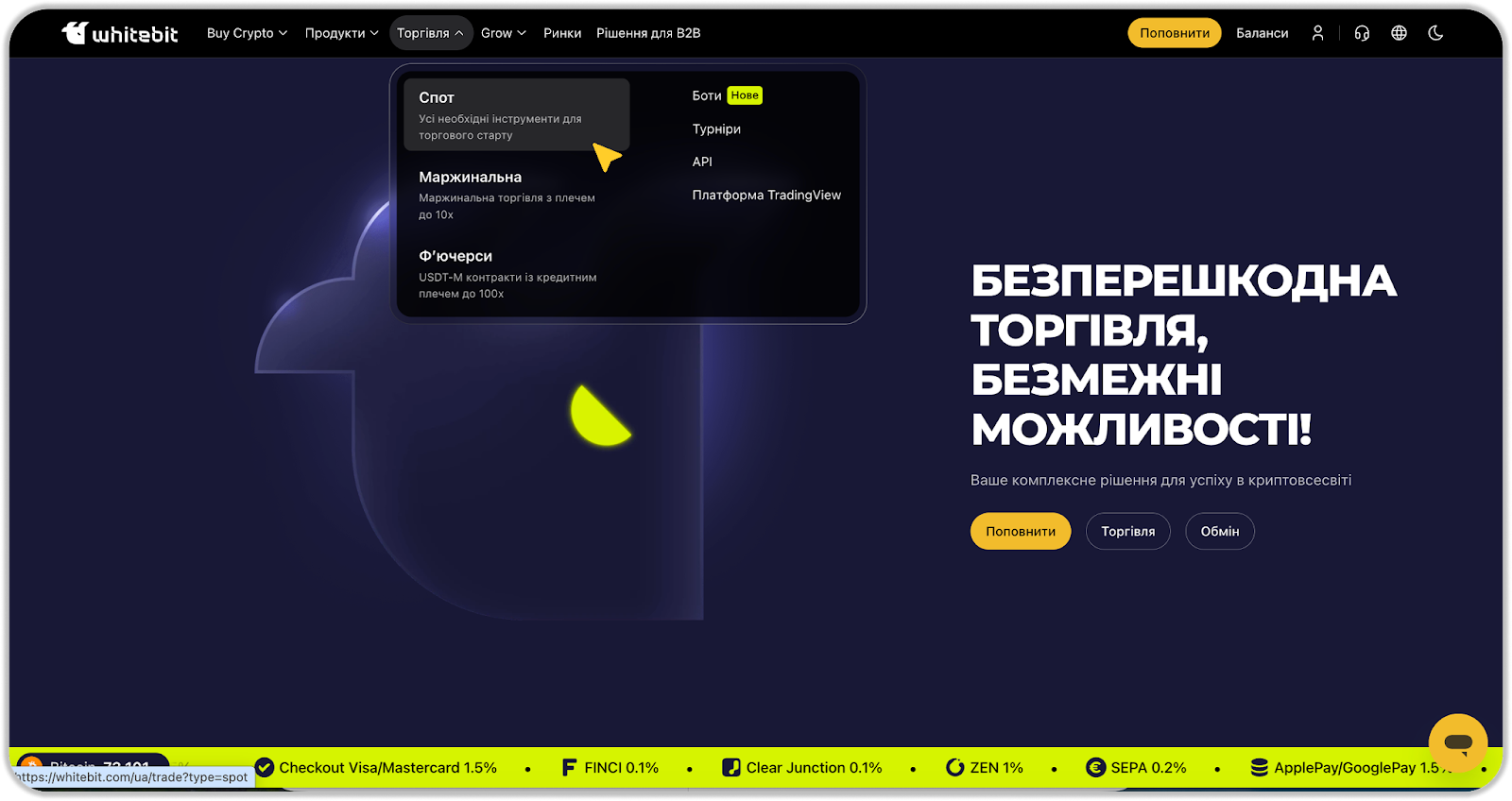 в правому нижньому кутку екрана (у застосунку WhiteBIT у правому верхньому кутку натисніть
