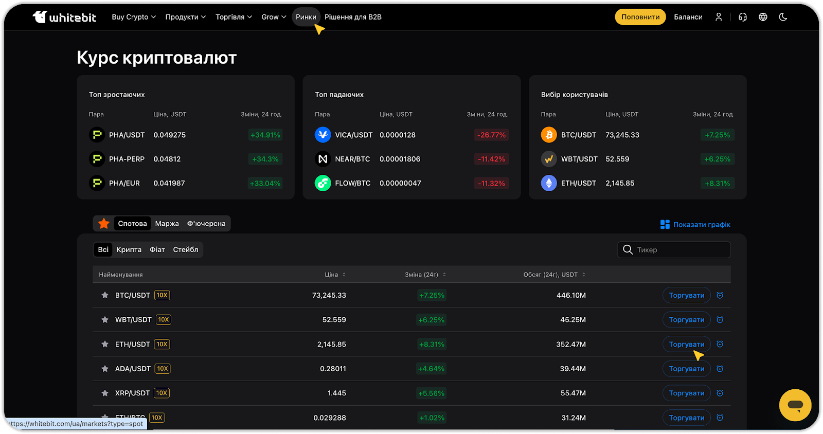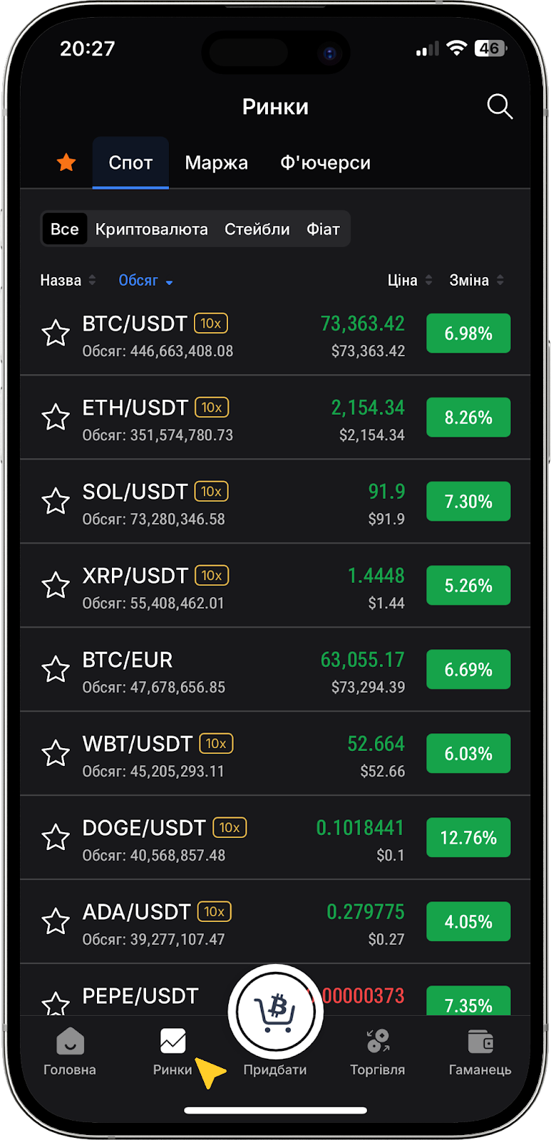 Ви також можете скористатися вкладкою «Маркети». Скористайтеся пошуком, виберіть доступну пару і натисніть на неї. Вас буде перенаправлено на сторінку з графіком. Там натисніть «Придбати» або «Продати».