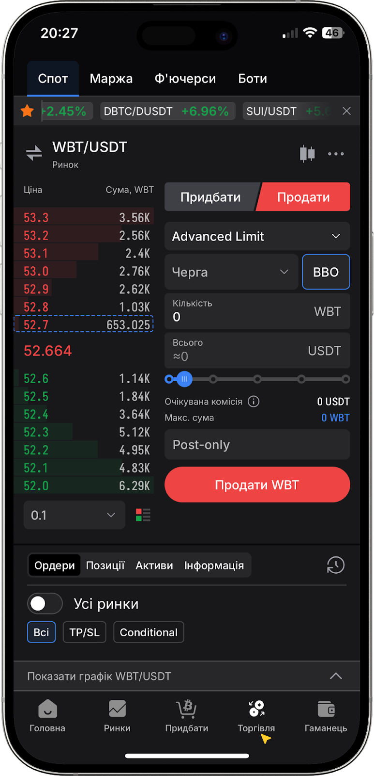 Розглянемо на практиці, як виставити ліміт чи стоп-ліміт ордер з опцією BBO у веб-версії біржі, а також в нашому мобільному додатку.
