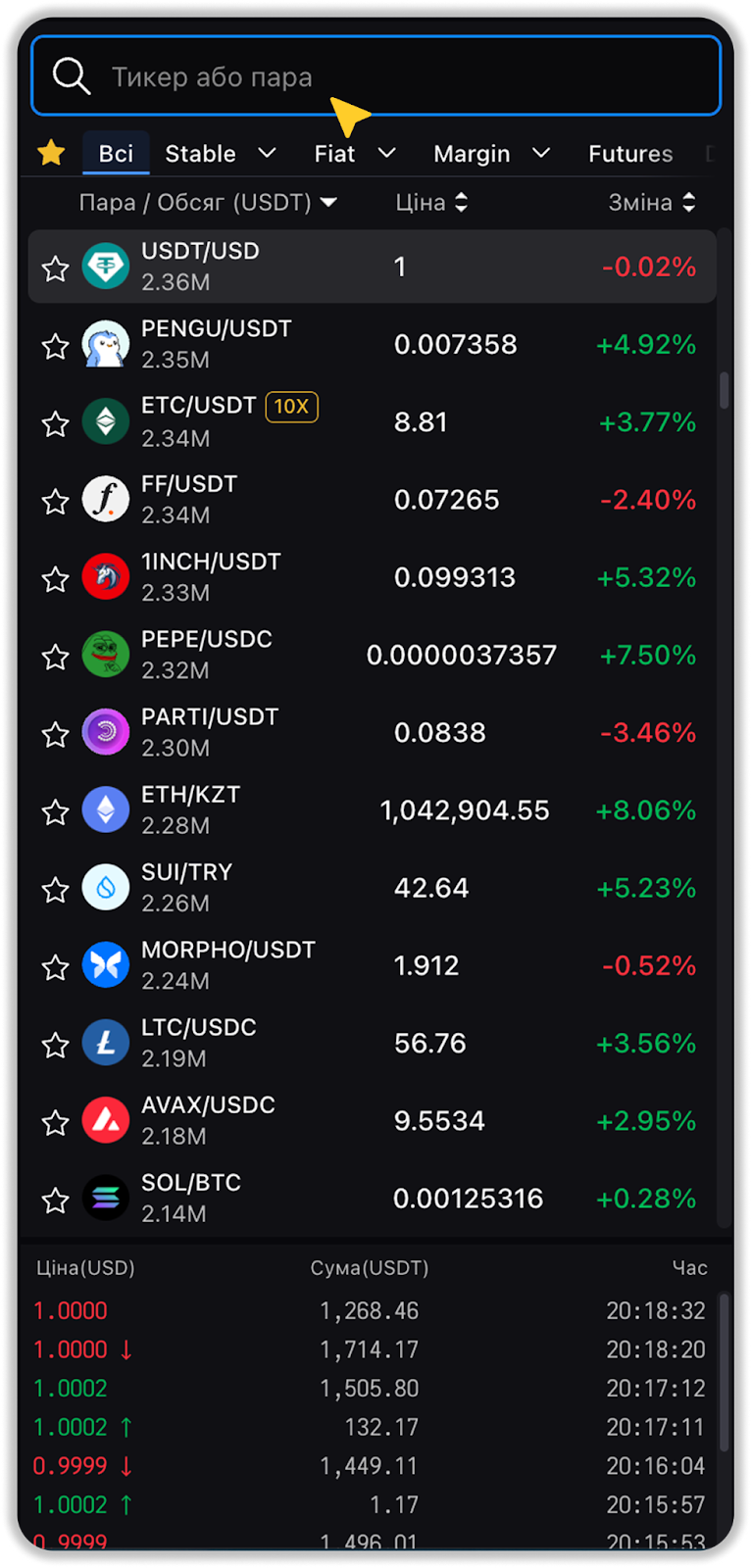 - Перейдіть на сторінку спотової торгівлі і виберіть торгову пару, яка вас цікавить, у випадаючому списку у верхній лівій частині екрана.