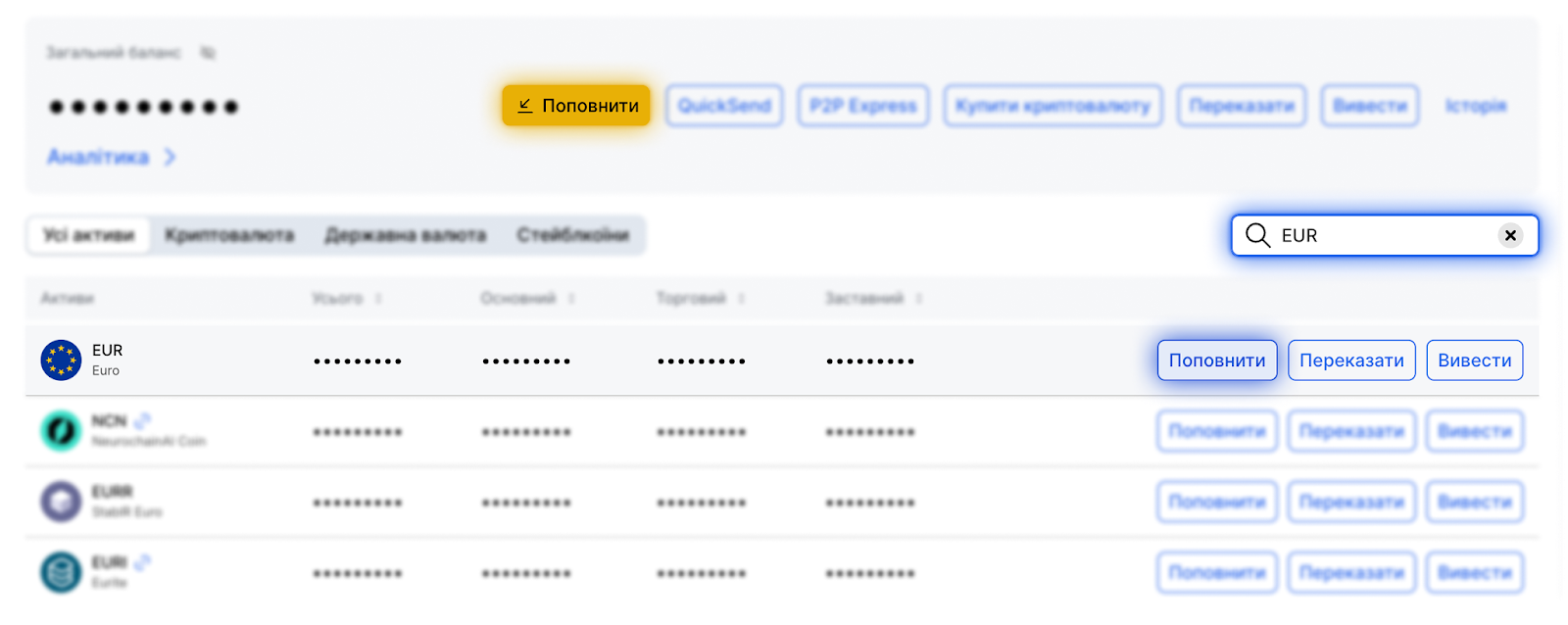 Знайдіть валюту за тикером «EUR» і натисніть на кнопку «Поповнити» або виберіть функцію «Поповнити» і EUR зі списку валюти.