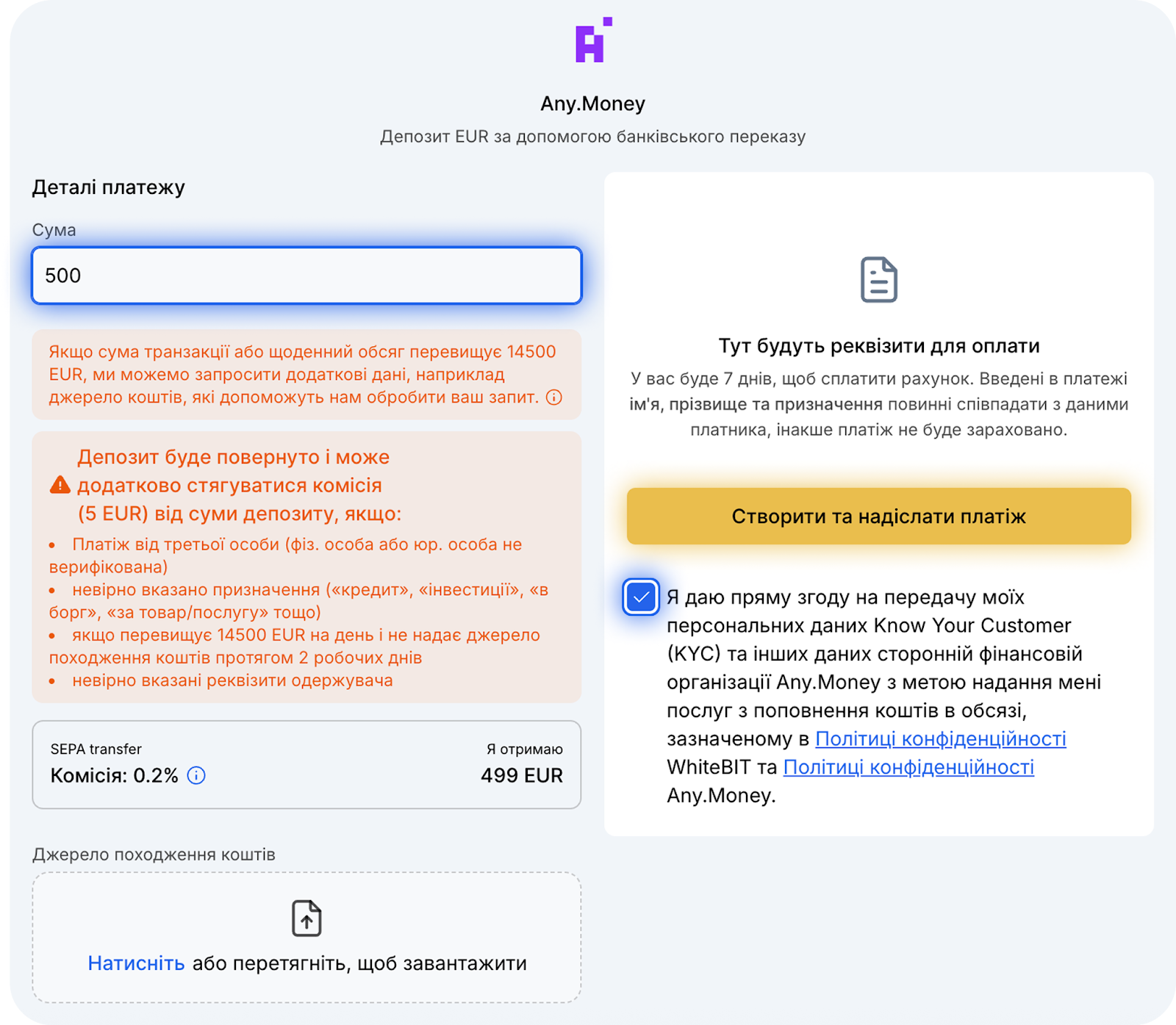 - Власник облікового запису на біржі може поповнити свій баланс за допомогою EUR SEPA тільки за умови збігу імені та прізвища, зазначених у KYC (підтвердженні особи користувача на біржі), з ім'ям і прізвищем власника рахунку в банку.