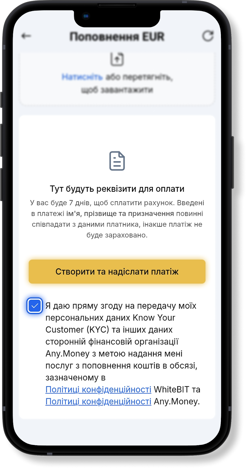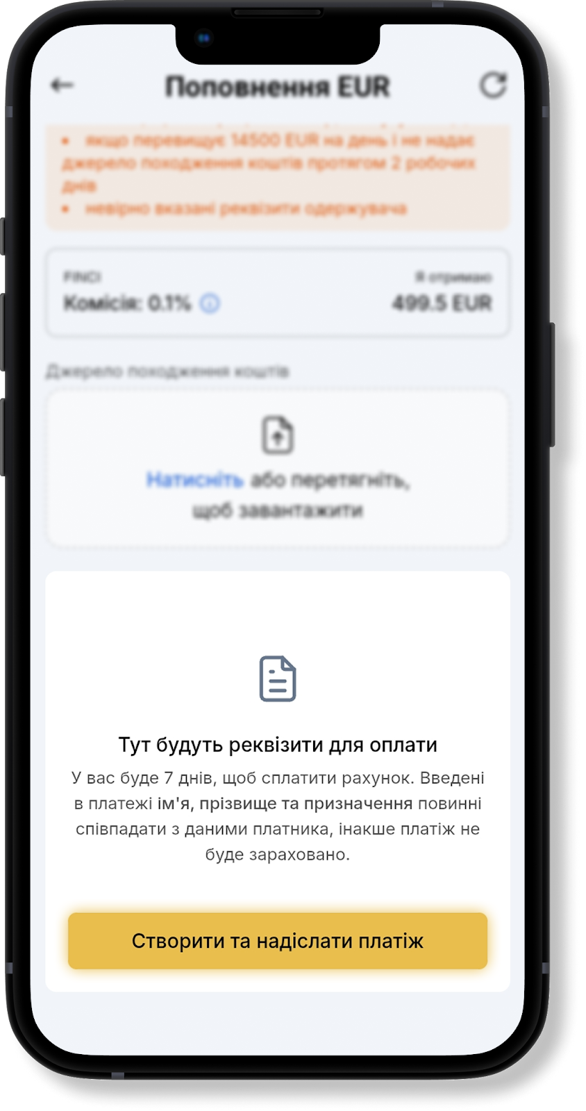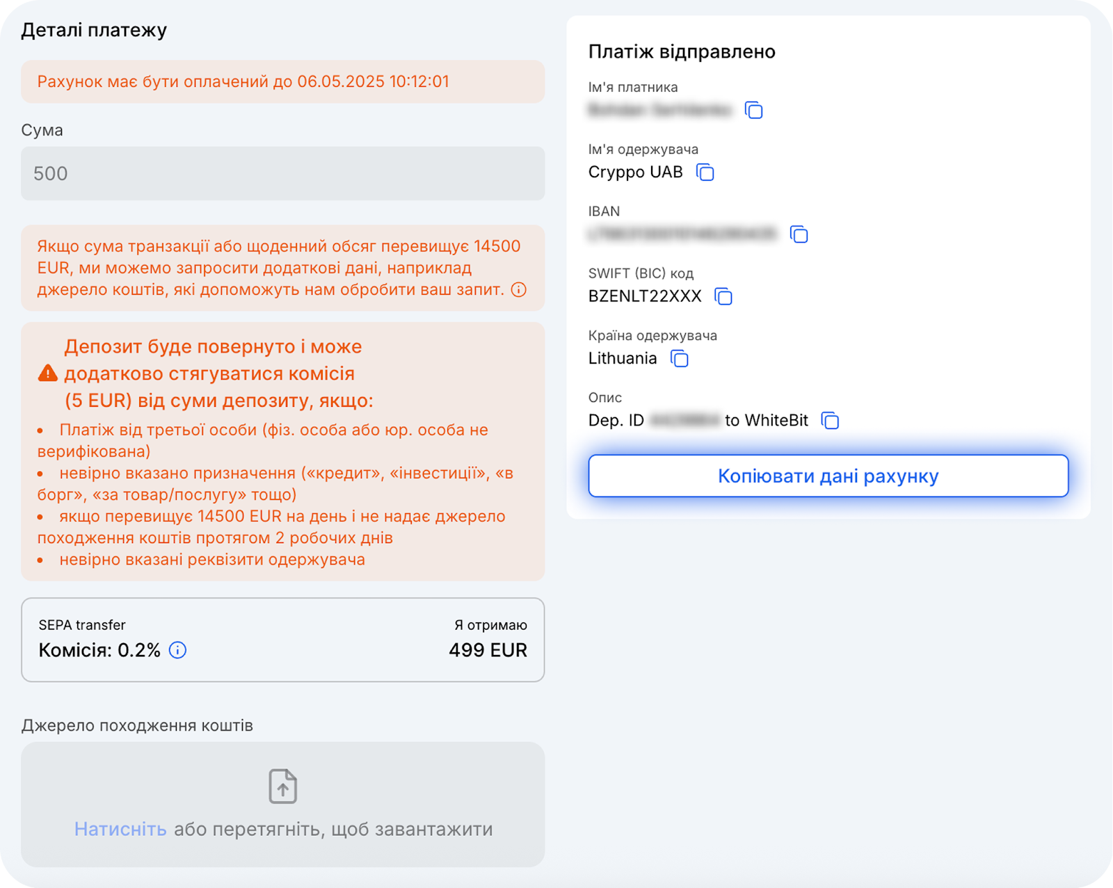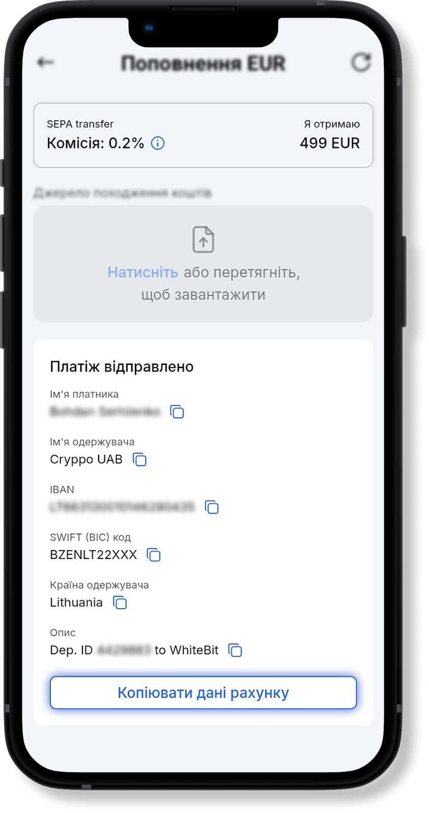 При поповненні EUR SEPA ім’я та прізвище відправника коштів мають збігатися з ім’ям та прізвищем, зазначеними в реквізитах на оплату. В іншому разі платіж не буде зараховано.