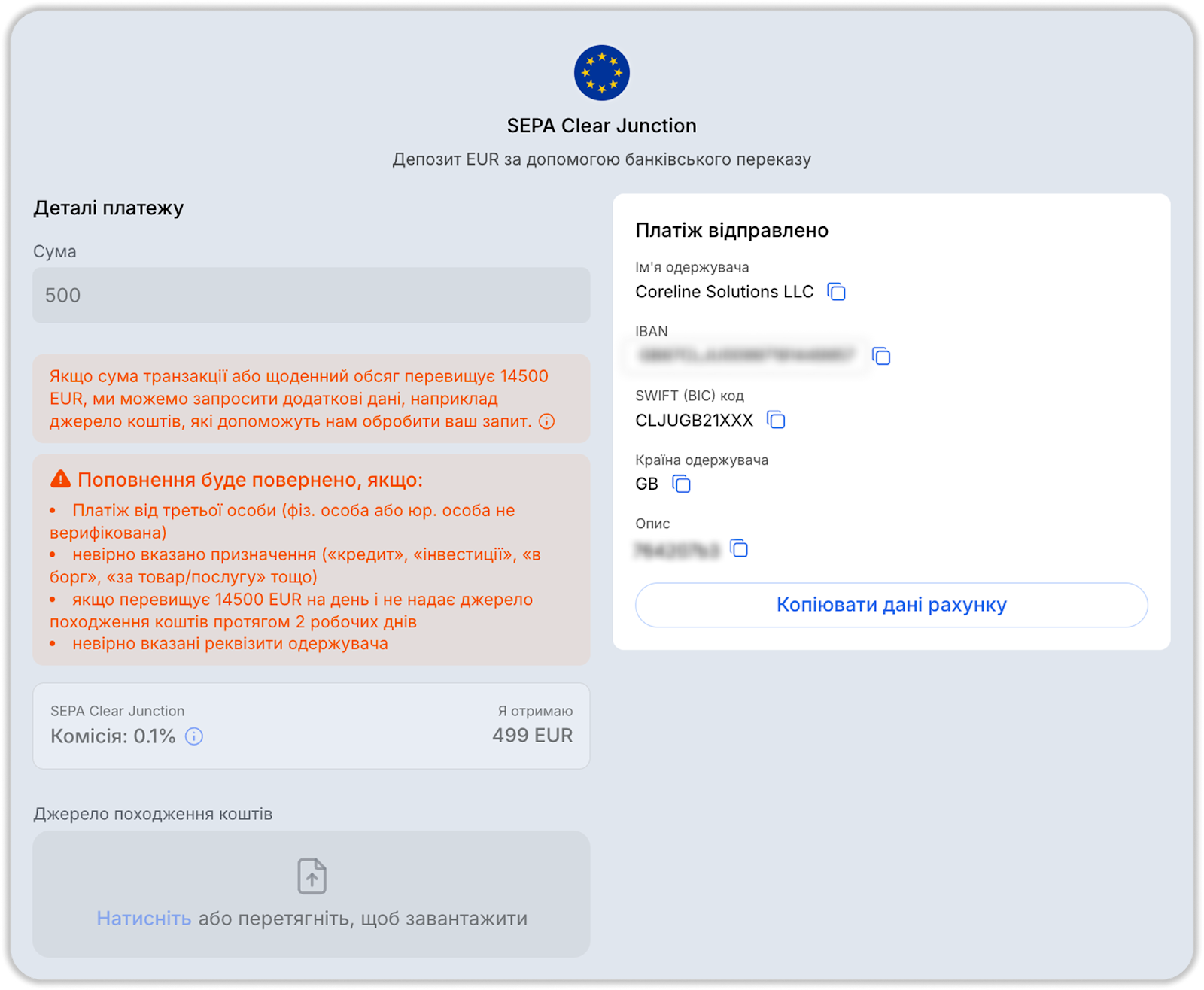 Зверніть увагу: при поповненні методом Clear Junction, для кожного користувача створюється індивідуальний IBAN.