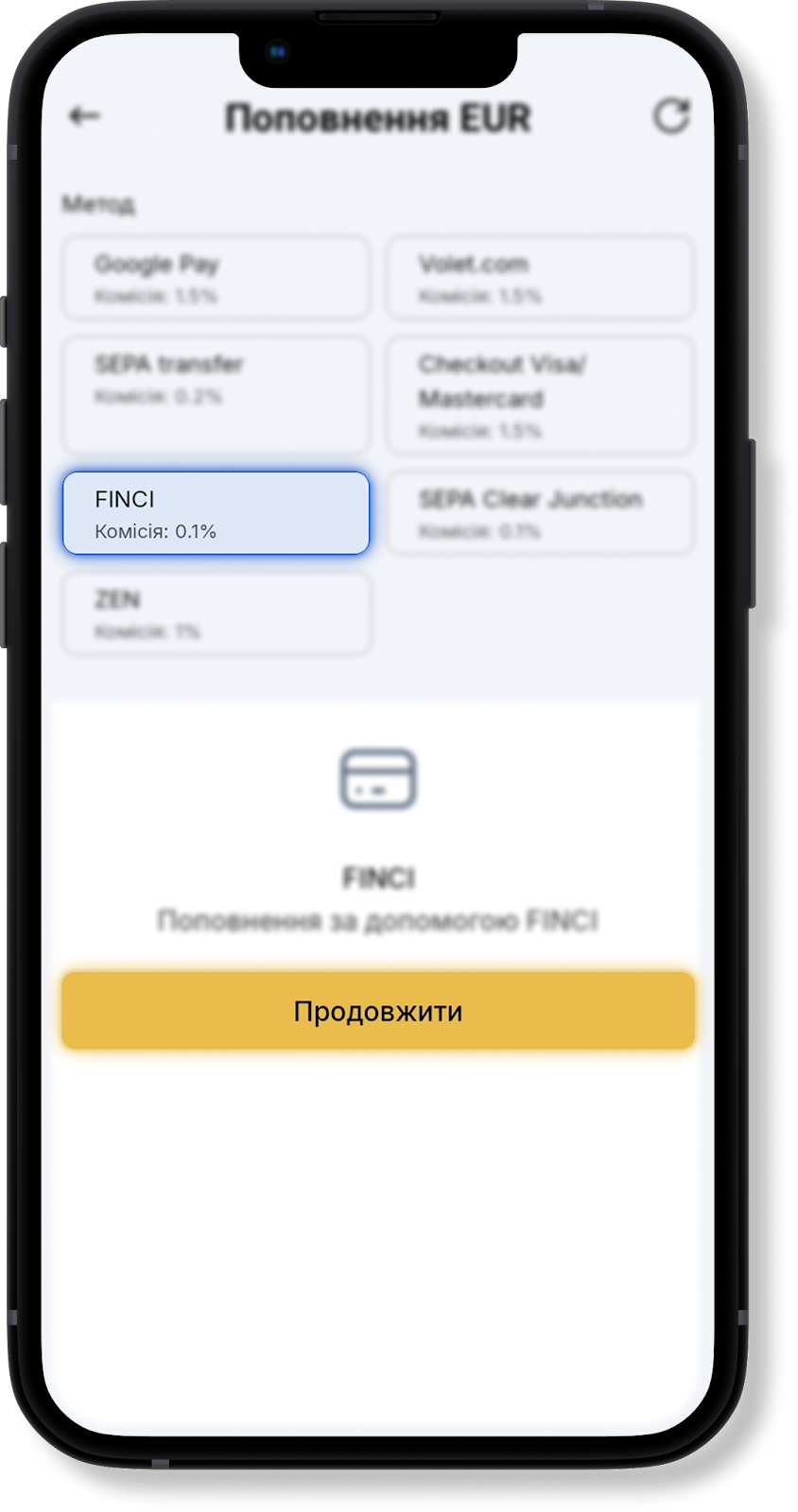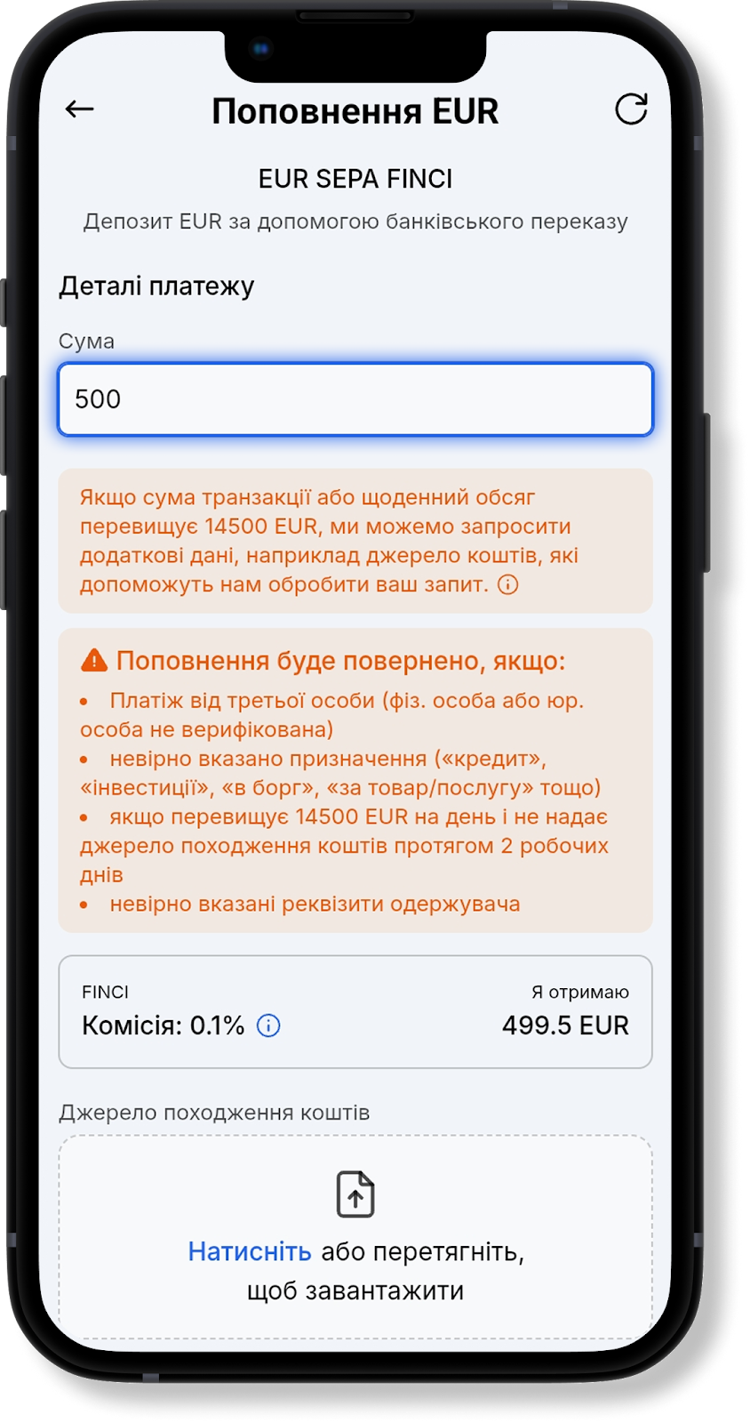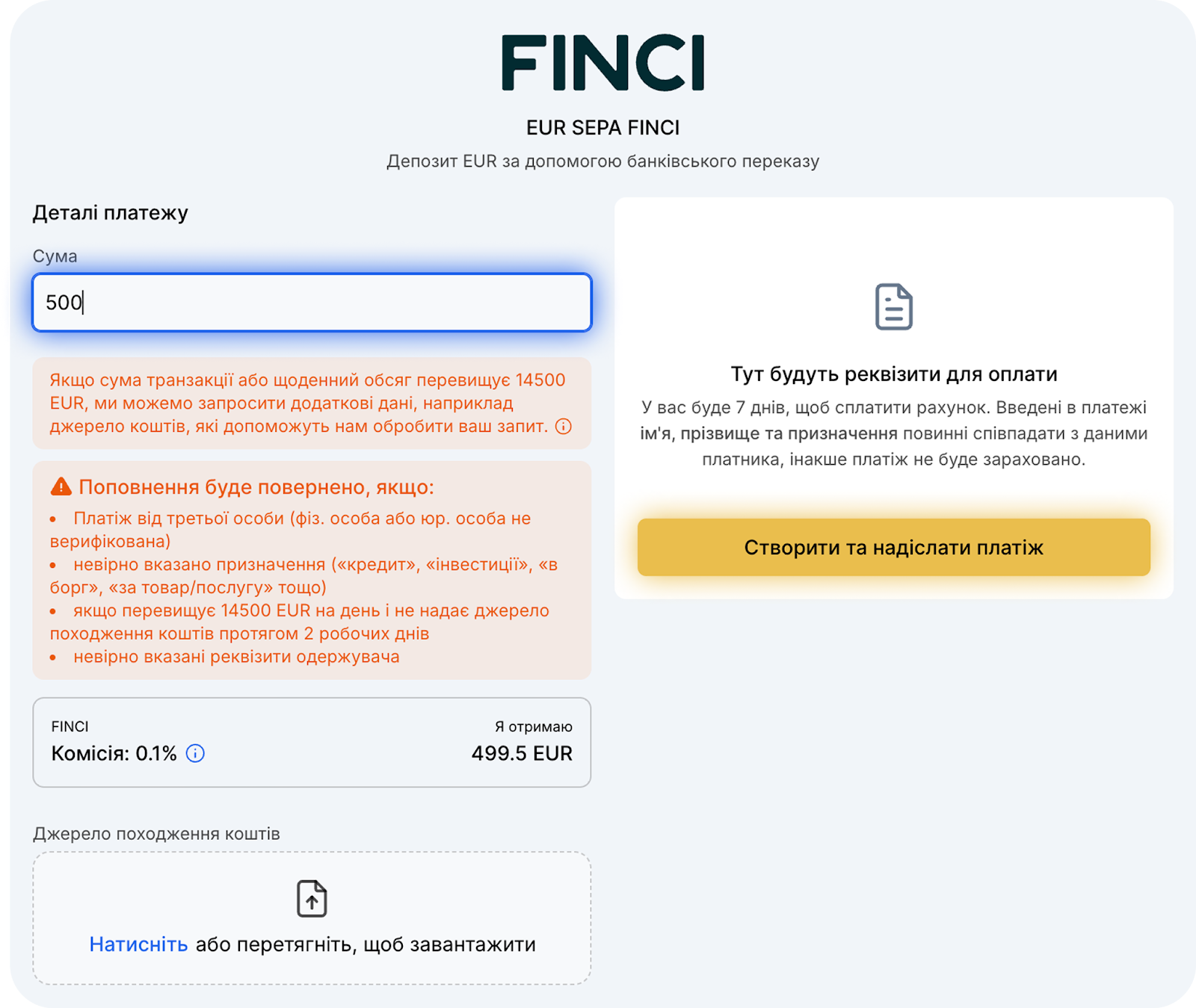 Ще одним провайдером для поповнення EUR є SEPA FINCI. Далі в цій статті ми розповімо про основні умови та ліміти під час використання цього методу поповнення.