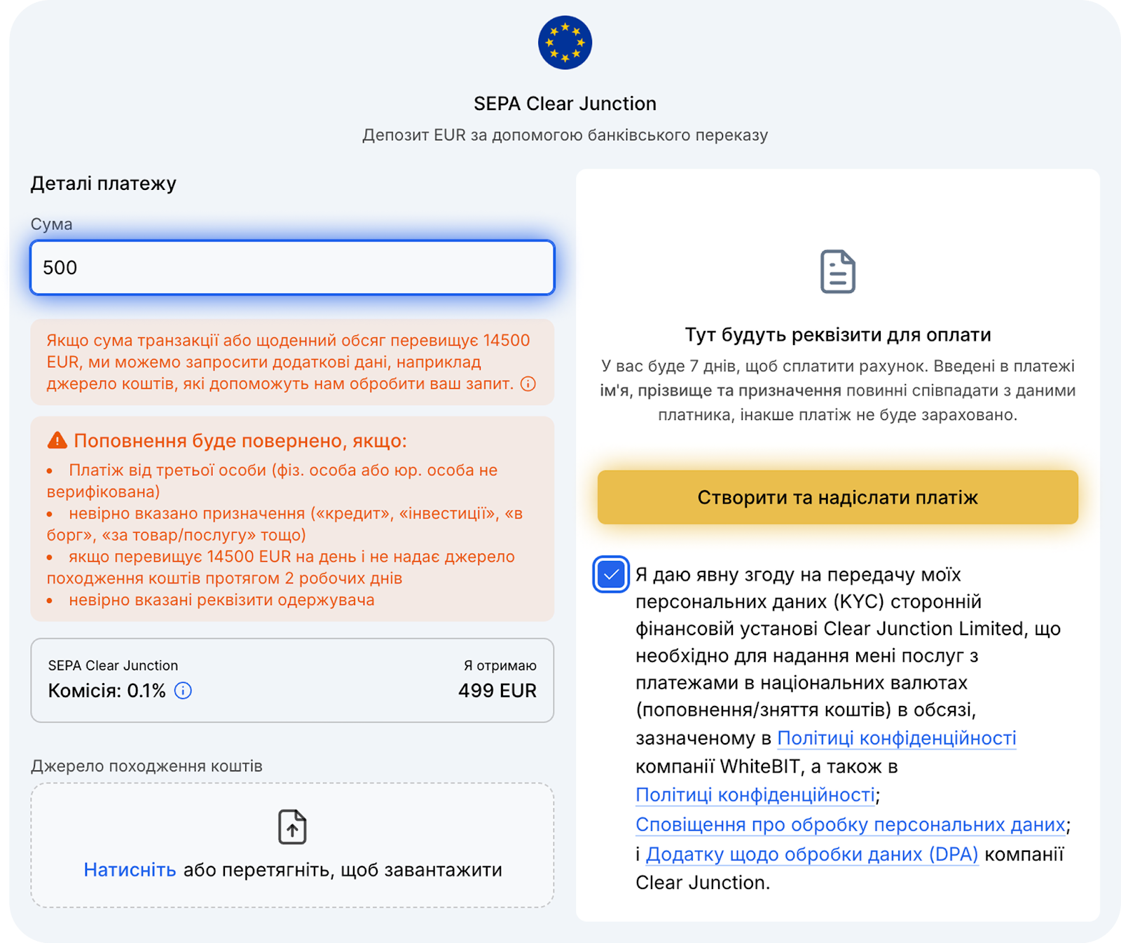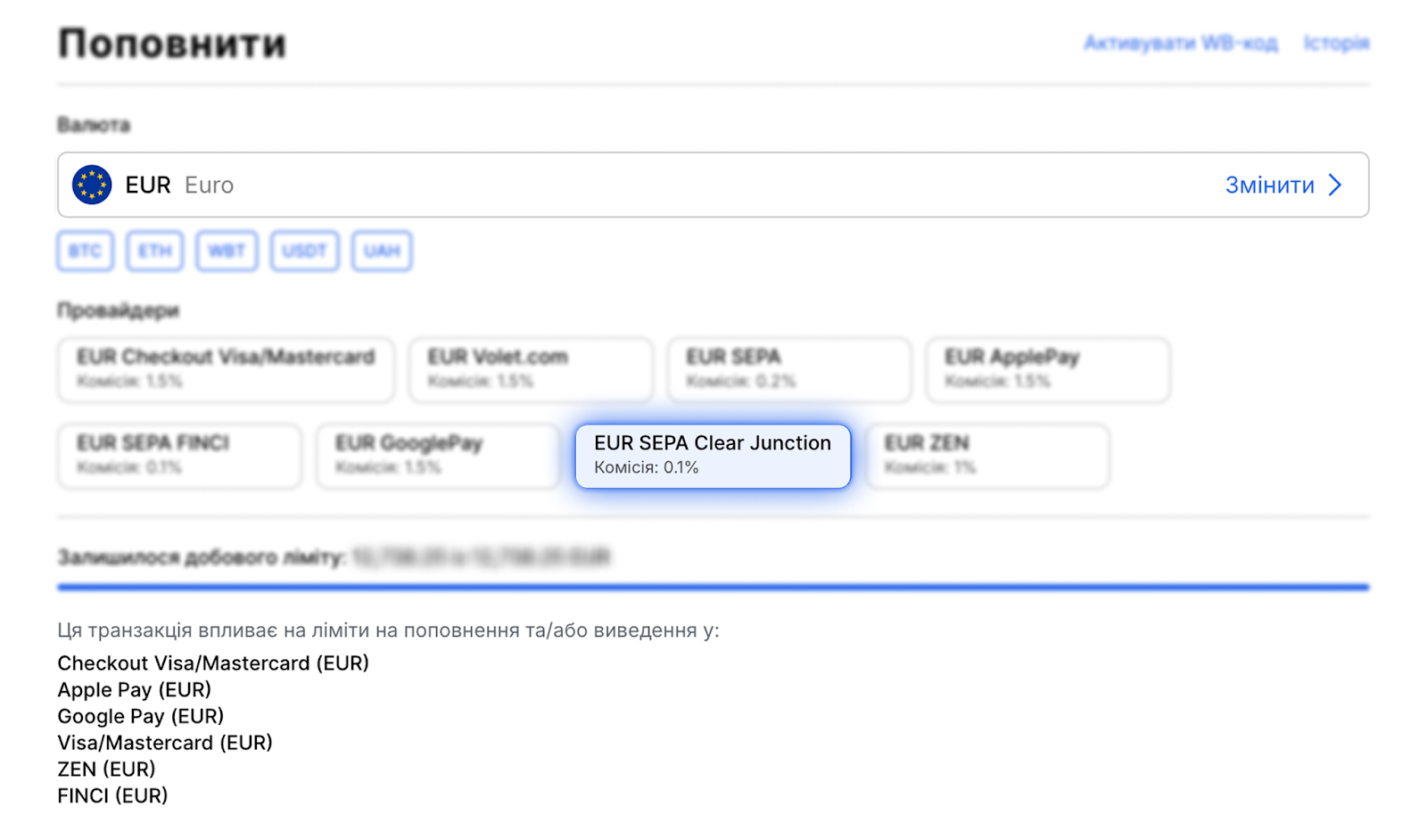 Важливо: для поповнень EUR не реалізовано опцію SEPA Instant Clear Junction, яка дає змогу здійснити транзакцію швидше в будь-який час. Однак якщо ваш банк підтримує перекази Instant, у разі вибору методу EUR SEPA Clear Junction вашу транзакцію в будь-якому разі буде оброблено швидше як Instant платіж.