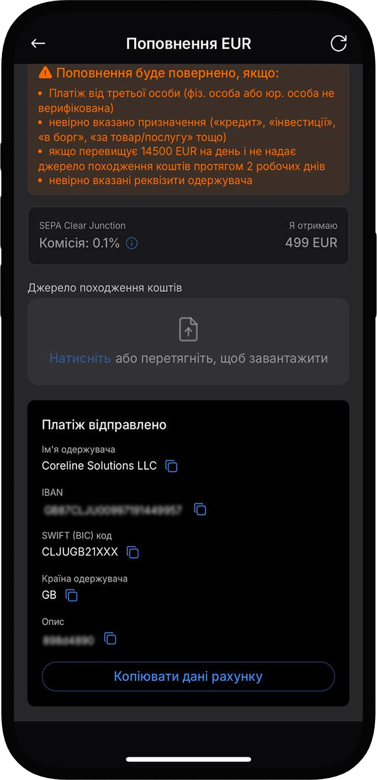 Для надсилання коштів скопіюйте інформацію з вікна «Платіж відправлено» та вставте у ваш банківський застосунок. Платіжні реквізити формуються індивідуально для кожного поповнення.