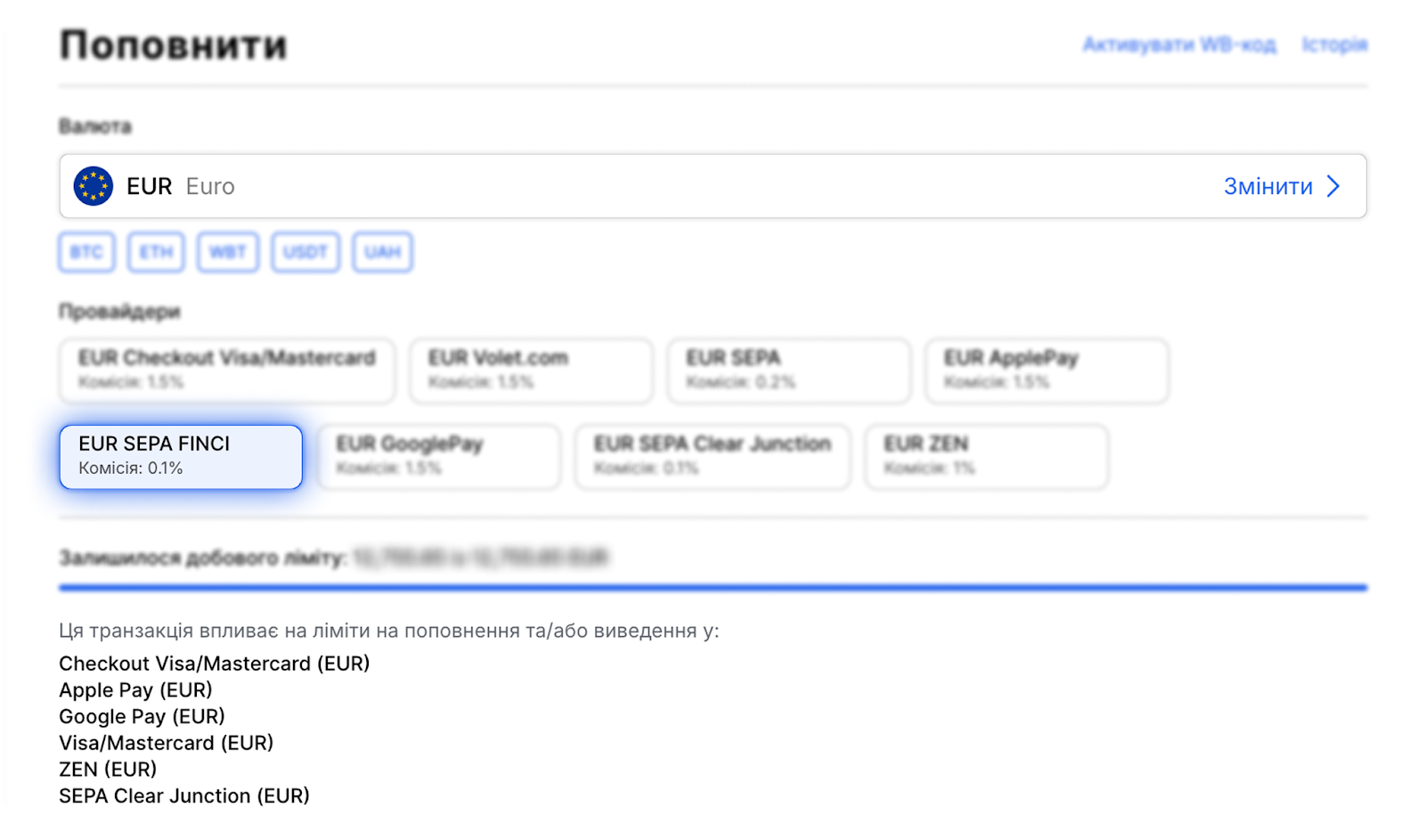 - Під час проведення транзакції необхідно враховувати мінімальну (10 EUR) і максимальну (14 500 EUR на день) суми поповнення, а також звернути увагу на комісію, яка залежить від вибору провайдера. Цю інформацію ви можете також знайти на сторінці Комісії.