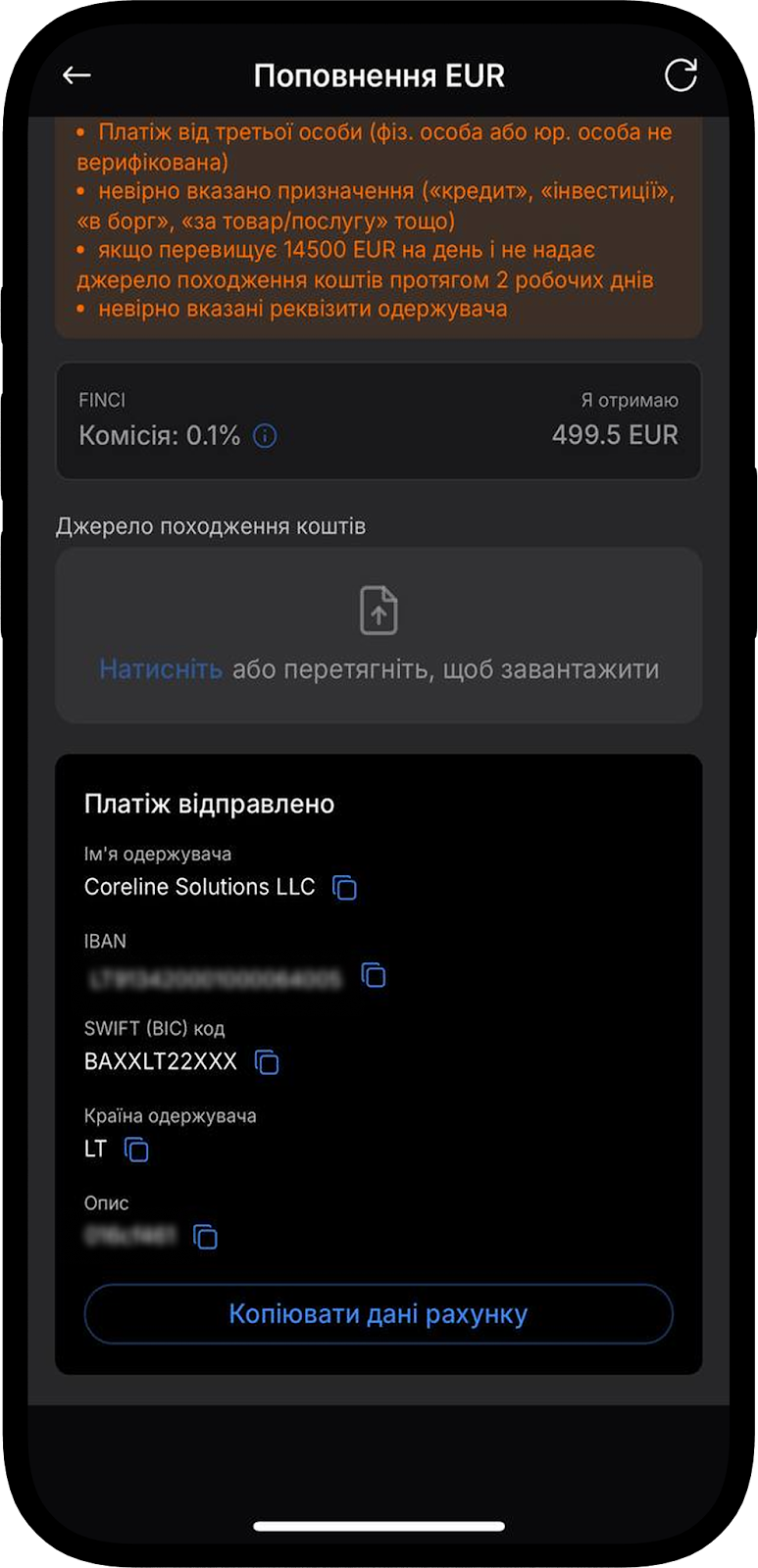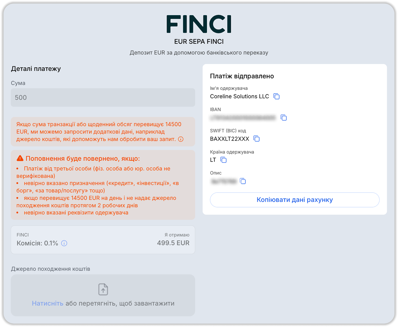 Зверніть увагу: при поповненні методом FINCI для всіх користувачів використовується єдиний IBAN — LT913420001000064005, що належить Coreline Solutions LLC.