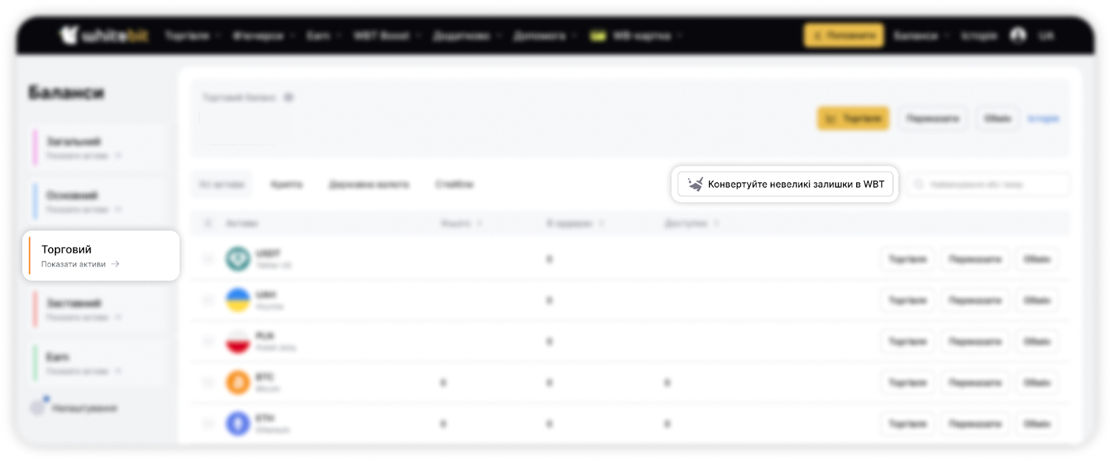 Щоб це зробити, необхідно перейти на сторінку торгового балансу та натиснути кнопку “Конвертуйте невеликі залишки у WBT”.