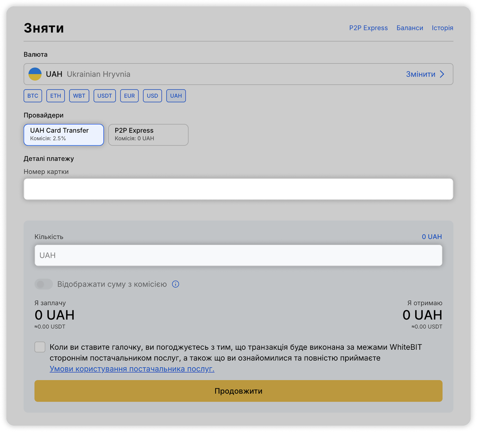 Card Transfer — зручний, швидкий та безпечний спосіб виведення української гривні (UAH) та поповнення свого балансу в UAH на WhiteBIT. Використовуючи цю платіжну систему, ви можете вивести кошти безпосередньо на вказаний номер банківської картки в інвойсі.