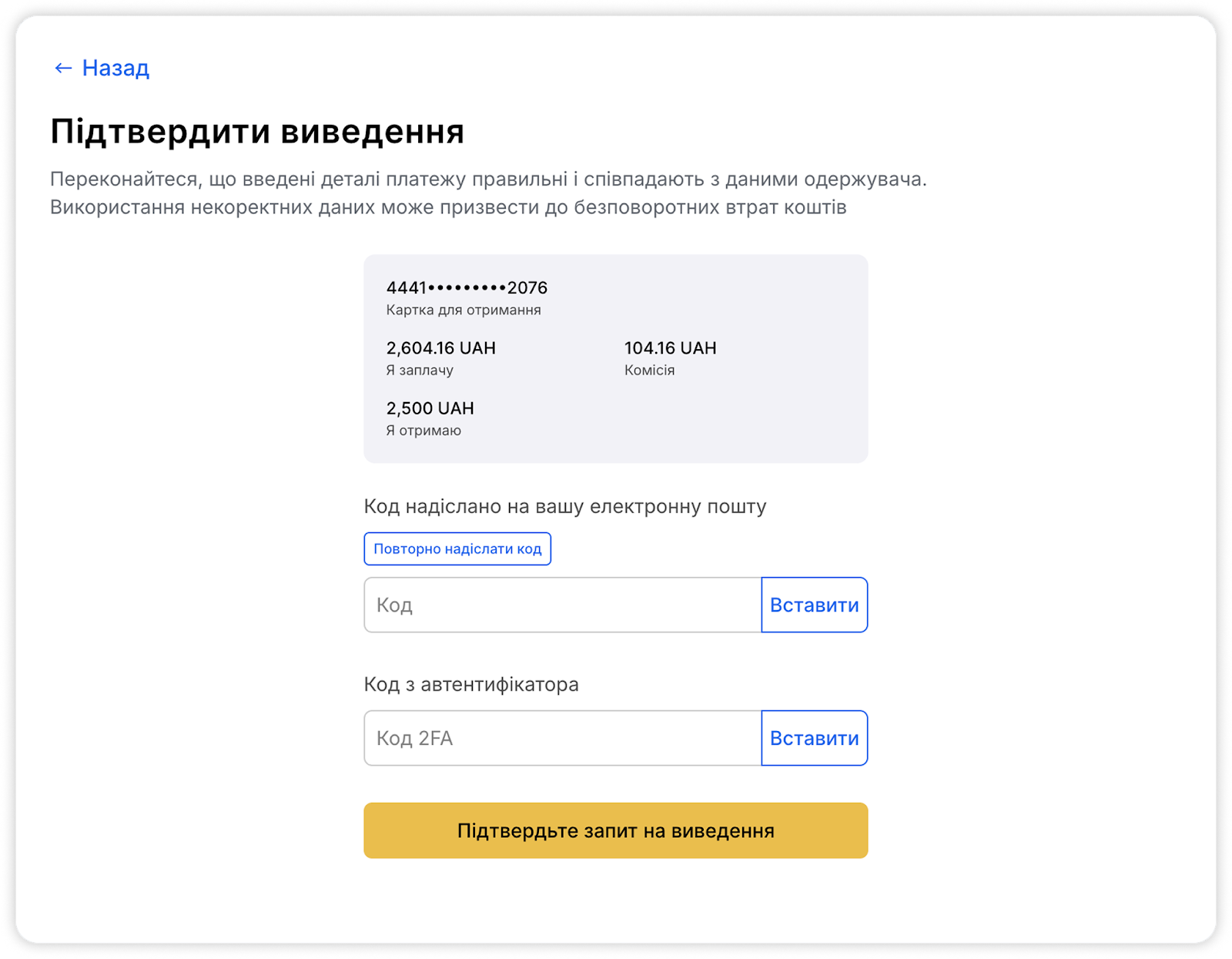 Зверніть увагу, що для підтвердження виведення коштів необхідно ввести перевірчий код, який буде надіслано на вашу пошту. Цей код буде дійсним протягом 180 секунд. Якщо на вашому обліковому записі включена двофакторна автентифікація, також необхідно буде ввести 2FA-код із додатка.