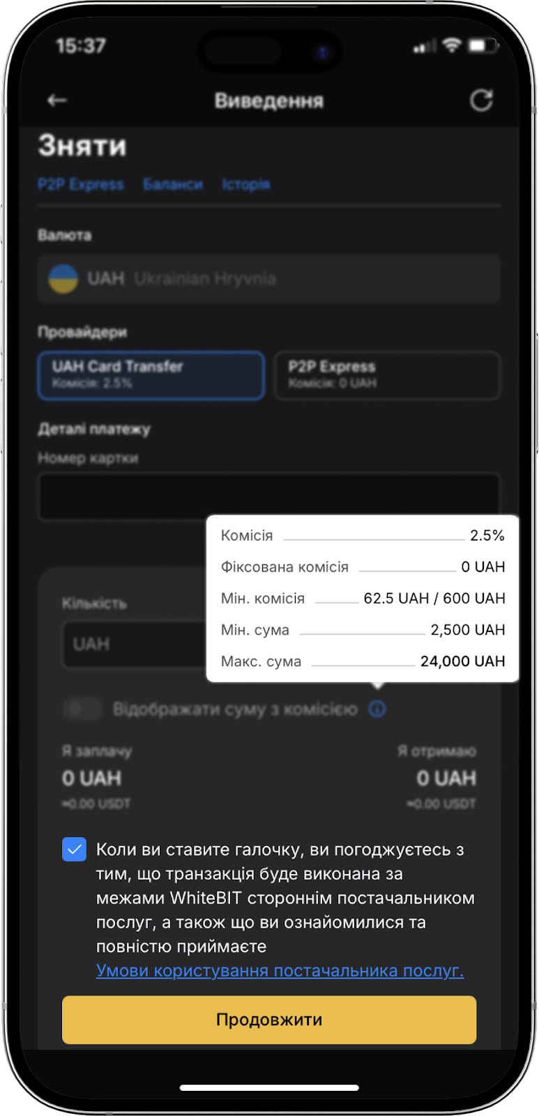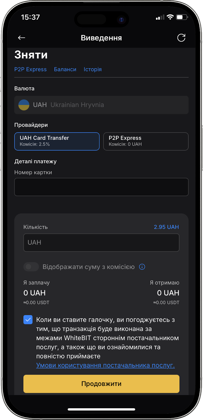 У вікні виберіть Card Transfer зі списку провайдерів. Вкажіть суму для виведення, номер вашої банківської картки.