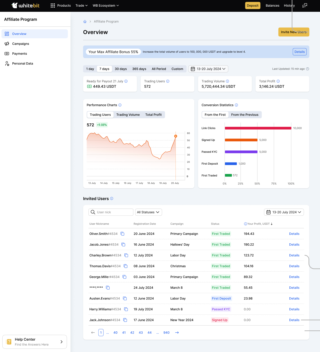 Таблиця «Запрошені користувачі» містить детальну інформацію про кожного користувача, якого ви запросили, включаючи його нікнейм, дату реєстрації, пов'язану з ним кампанію, поточний статус і прибуток, який він згенерував. Фільтри у верхній частині таблиці дозволяють легко сортувати користувачів за статусом або датою реєстрації.