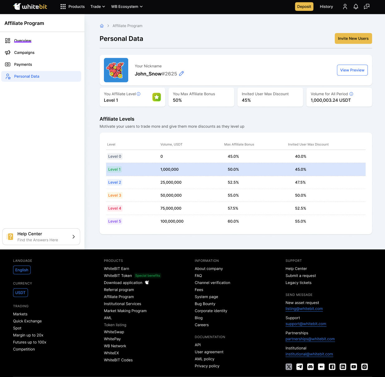 Приєднання до криптовалютної афіліатної програми WhiteBIT відкриває безліч можливостей для максимізації вашого заробітку. З комісією за замовчуванням від 45%, яка може зрости до 60% при досягненні більших обсягів торгівлі, ви можете заробляти, просто запрошуючи користувачів приєднатися до нашої платформи. Дізнайтеся більше в нашій статті про партнерську програму.