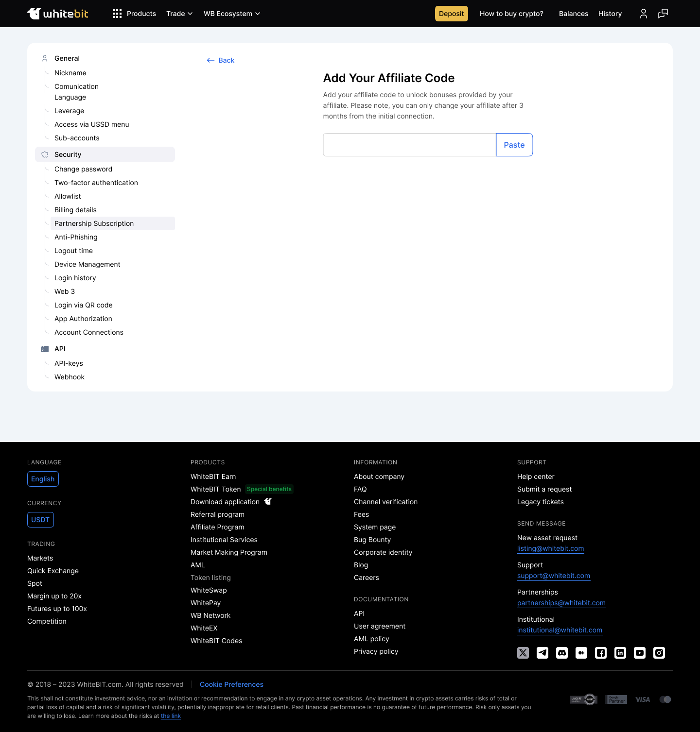 Ви можете вказати афіліатний код під час реєстрації або змінити реферальну підписку якщо ви вже реєструвалися у вкладці “Безпека - Партнерська підписка”.