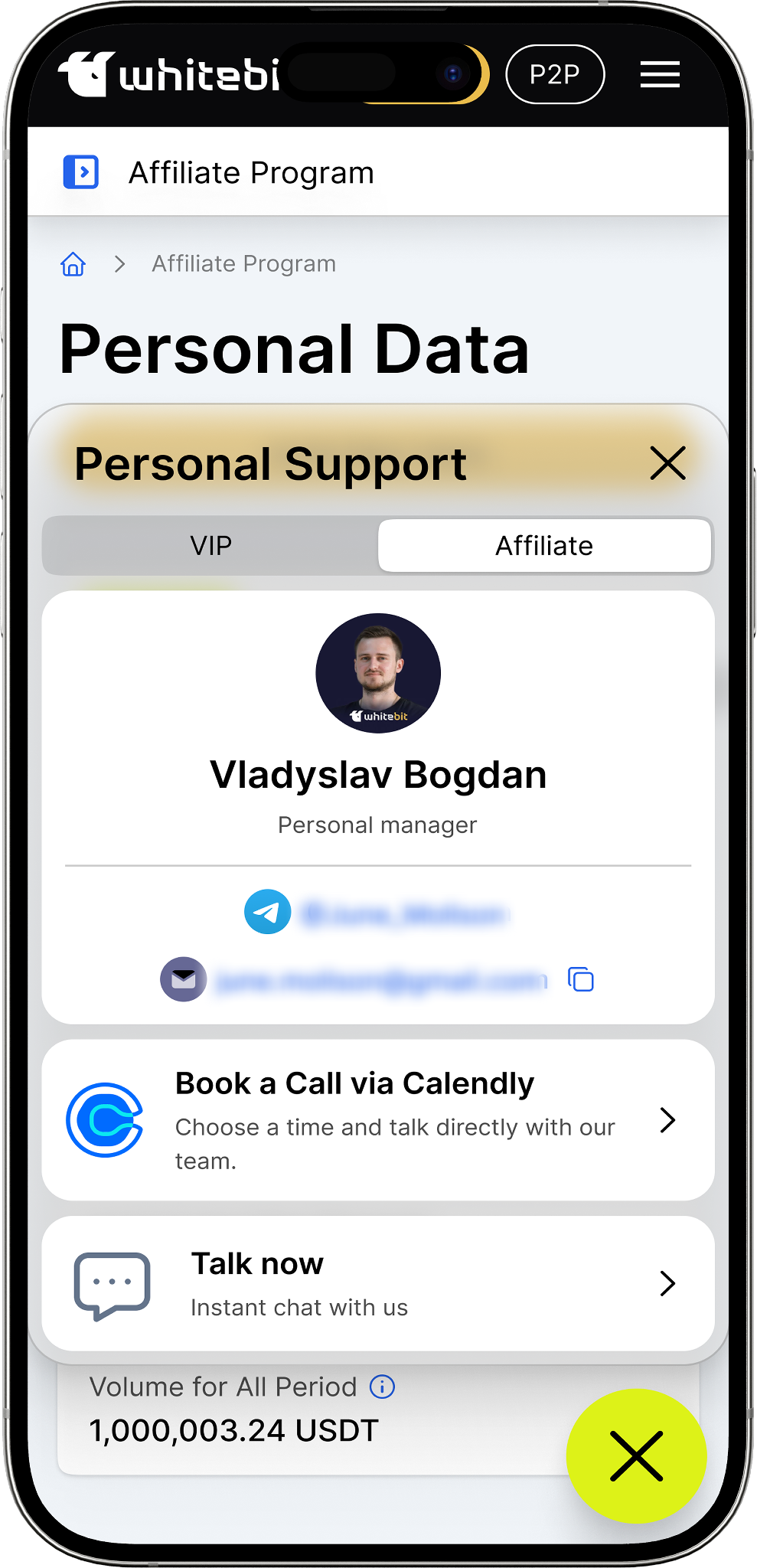 У межах афіліатної програми користувачам доступний віджет персональної підтримки, який забезпечує зв’язок з їхнім персональним афіліатним менеджером.