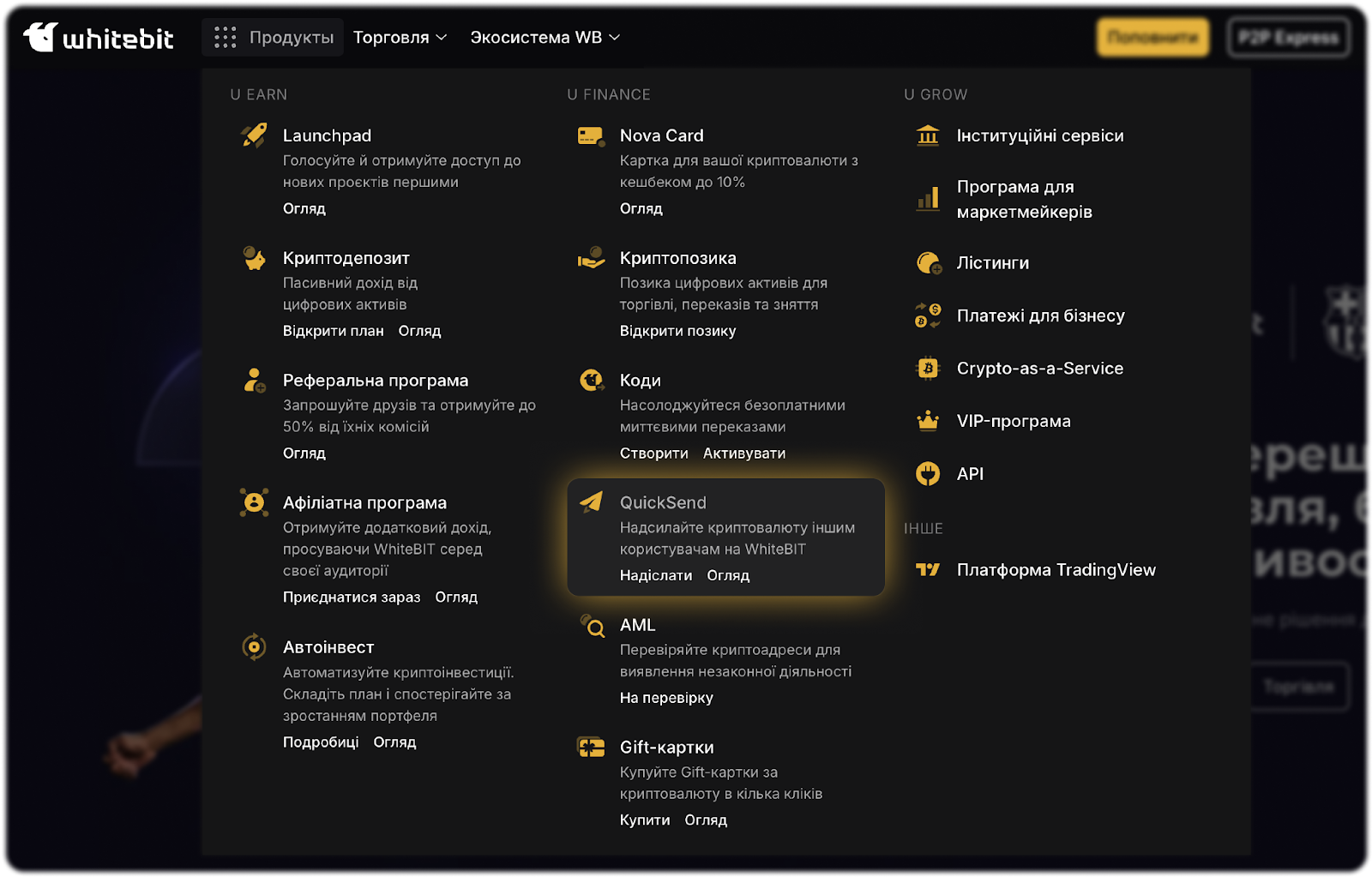 - Перейдіть на головну сторінку WhiteBIT - розділ «Продукти», де серед опцій U FINANCE ви знайдете інструмент QuickSend;
