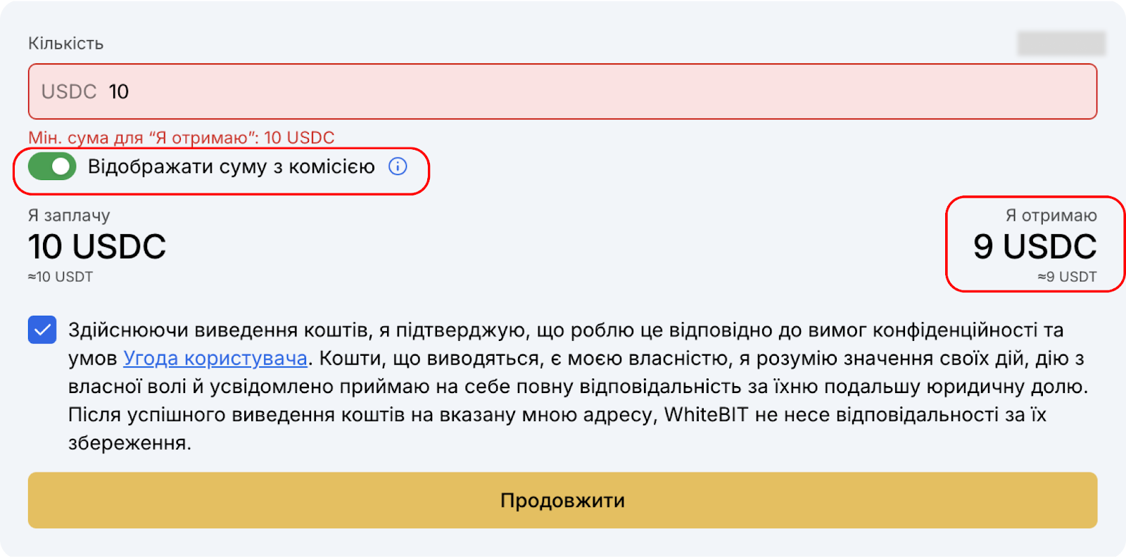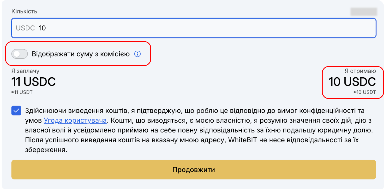 На скриншоті ви можете бачити вікно виведення USDC. Перемикач "Відображати суму з комісією" визначає, яку суму отримає одержувач залежно від суми, що списується з балансу: