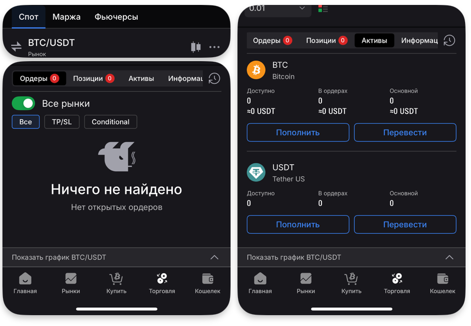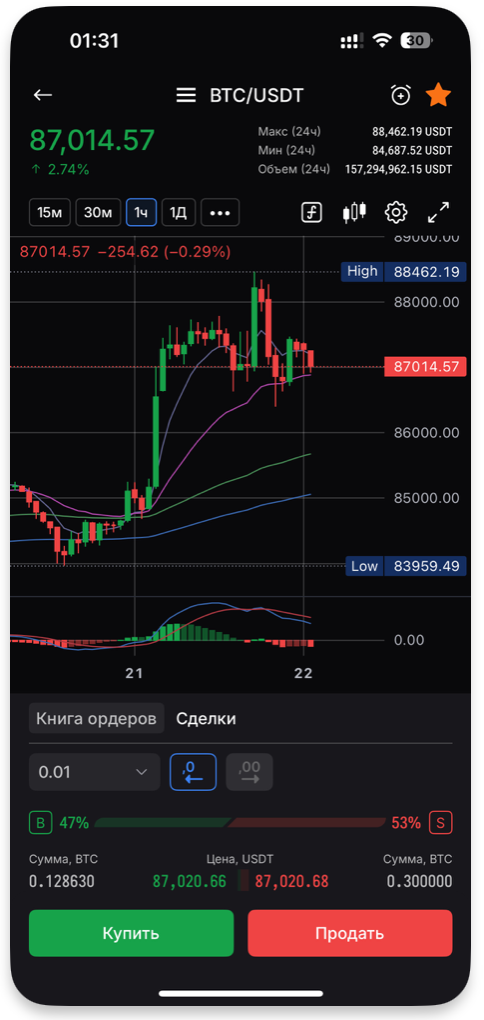 Торговий термінал — це універсальний інструмент для аналізу ринку і здійснення угод. Він об'єднує в собі графік з розширеними налаштуваннями, біржовий стакан, історію торгів і зручну систему розміщення ордерів.