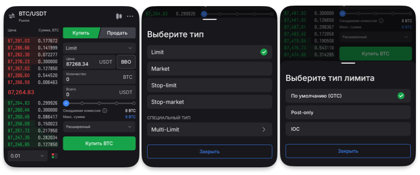 - Post-only – гарантує, що ордер буде додано до книги ордерів як лімітний і не виконається миттєво.