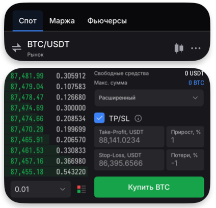 Крім того, тут можна увімкнути режим маржинальної торгівлі, який відкриває доступ до додаткових інструментів, таких як Stop-Loss і Take-Profit ордери — один з найважливіших інструментів в управлінні ризиками. Якщо встановити заздалегідь визначену точку виходу з позиції (SL), можна контролювати максимальну суму, яку ви готові втратити з угоди. А заявки TP, навпаки, дають змогу фіксувати прибуток, коли ринок досягає бажаного рівня і скористається сприятливими ринковими рухами. Детальніше в нашій статті за посиланням.