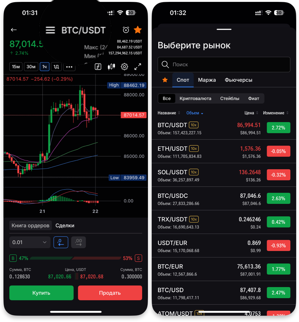 У верхній частині торгового термінала можна вибрати потрібну торгову пару. У відповідному полі ви можете ввести тікер або відфільтрувати список, наприклад, за спотовими або ф'ючерсними парами. Поруч з обраною парою відображається коротка статистика, включно з обсягом торгів і зміною курсу за 24 години.