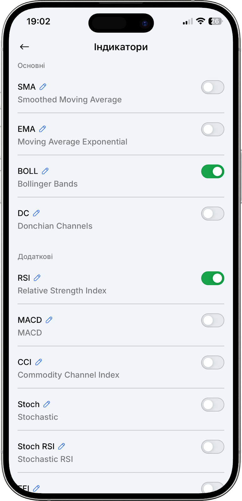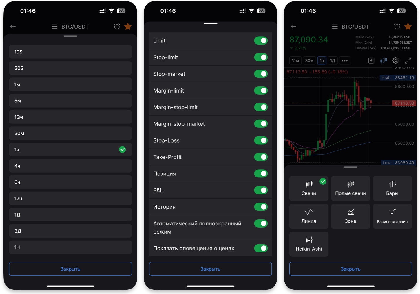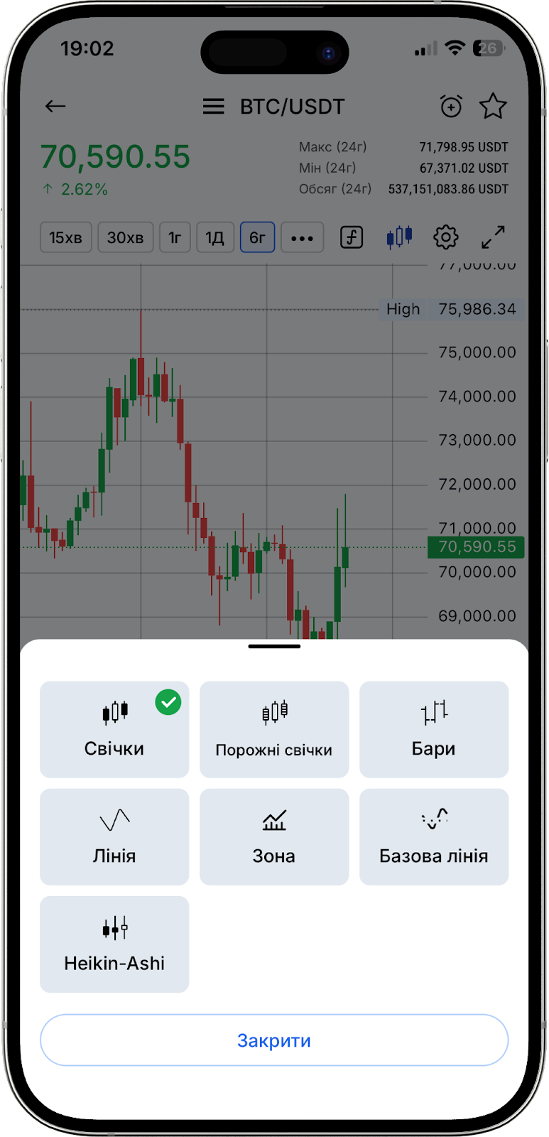 У цій же секції можна вибрати часовий інтервал свічок, налаштувати швидкий доступ до обраних інструментів, змінити тип відображення графіка (наприклад, японські свічки або бари), а також відредагувати режим відображення.