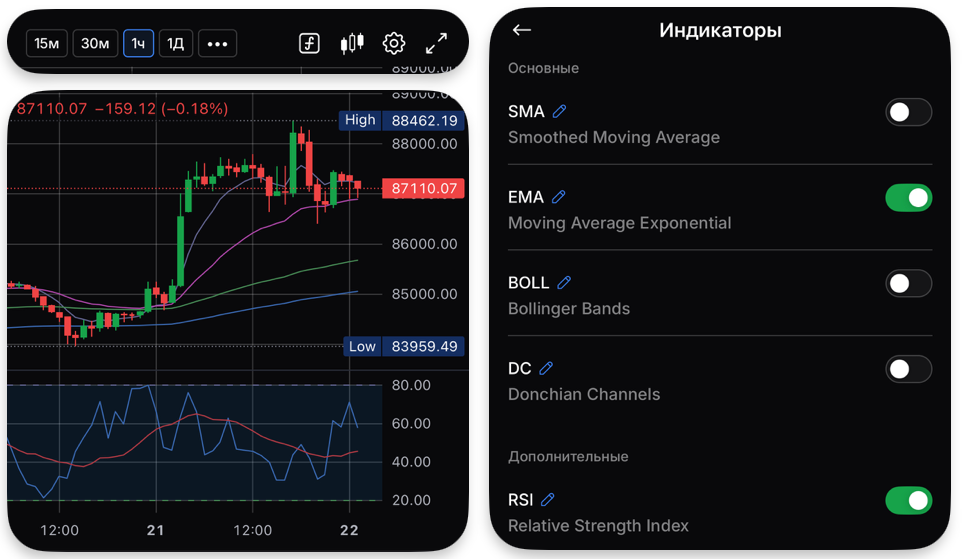 Окремо варто відзначити вибір індикаторів та інструментів для аналізу ринкових рухів і трендів на графіку. Тут можна додати до графіка різні індикатори, як-от EMA (експоненціальна ковзна середня) для виявлення трендів або Volume (обсяг торгів) для аналізу активності на ринку. Крім того, доступні додаткові інструменти, що дають змогу деталізувати технічний аналіз, наприклад RSI, MACD або Bollinger Bands.