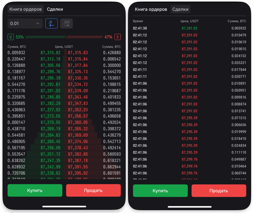 - Переглядати спред (різницю між найкращими цінами купівлі та продажу).