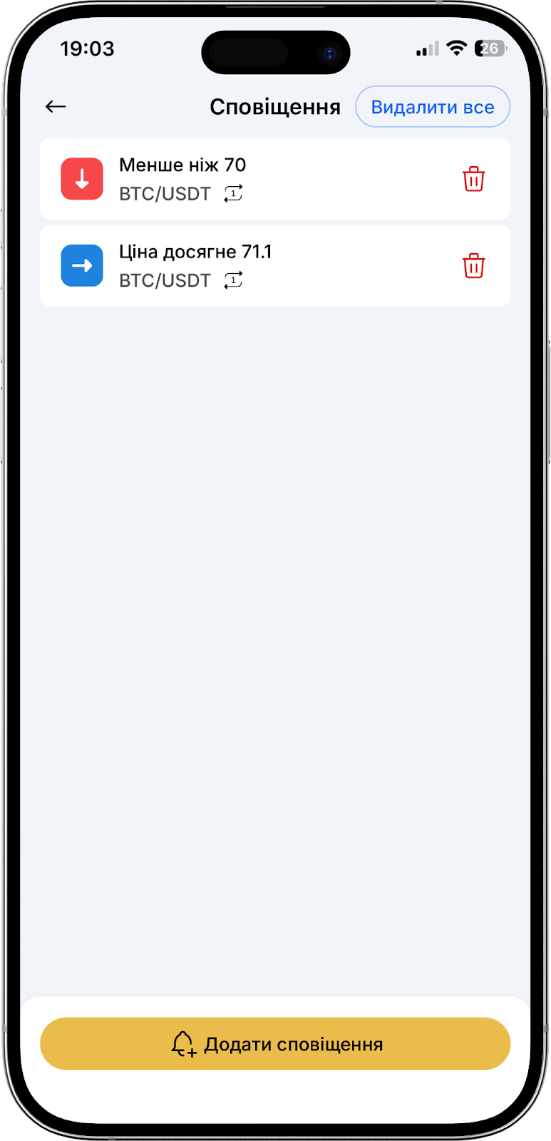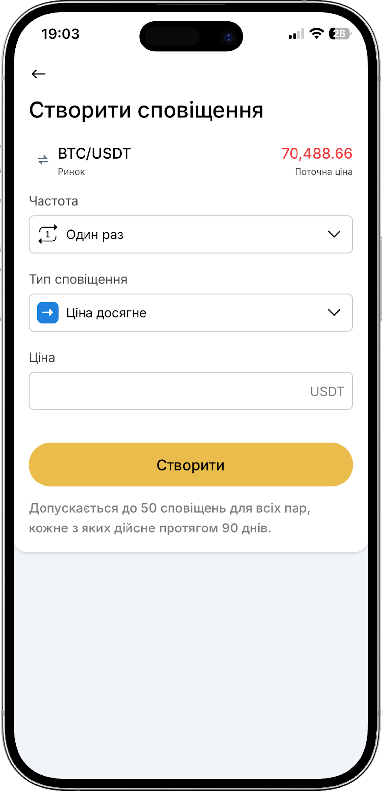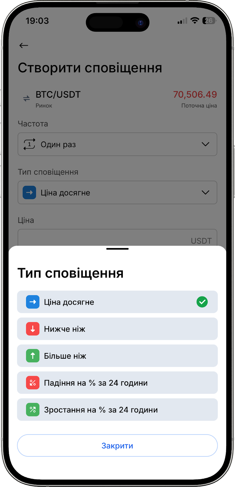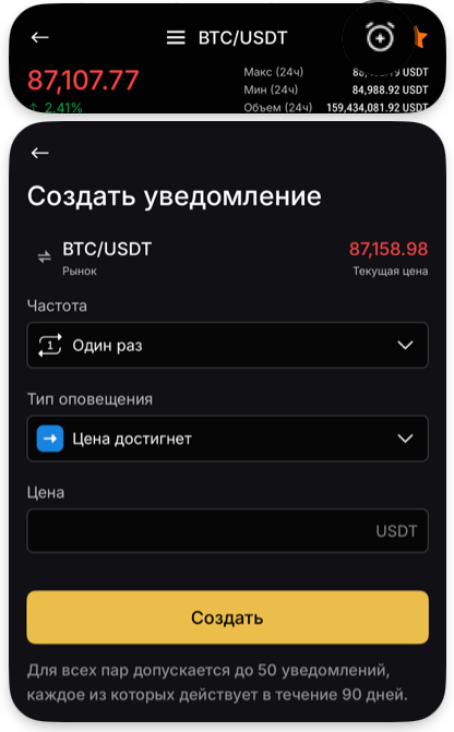Крім того, ви можете розгорнути графік на повний екран для зручнішого аналізу, або налаштувати сповіщення за конкретною ціною або відсотковою зміною активу, вибравши значок будильника.